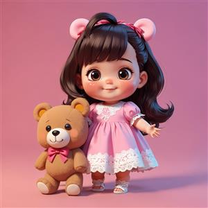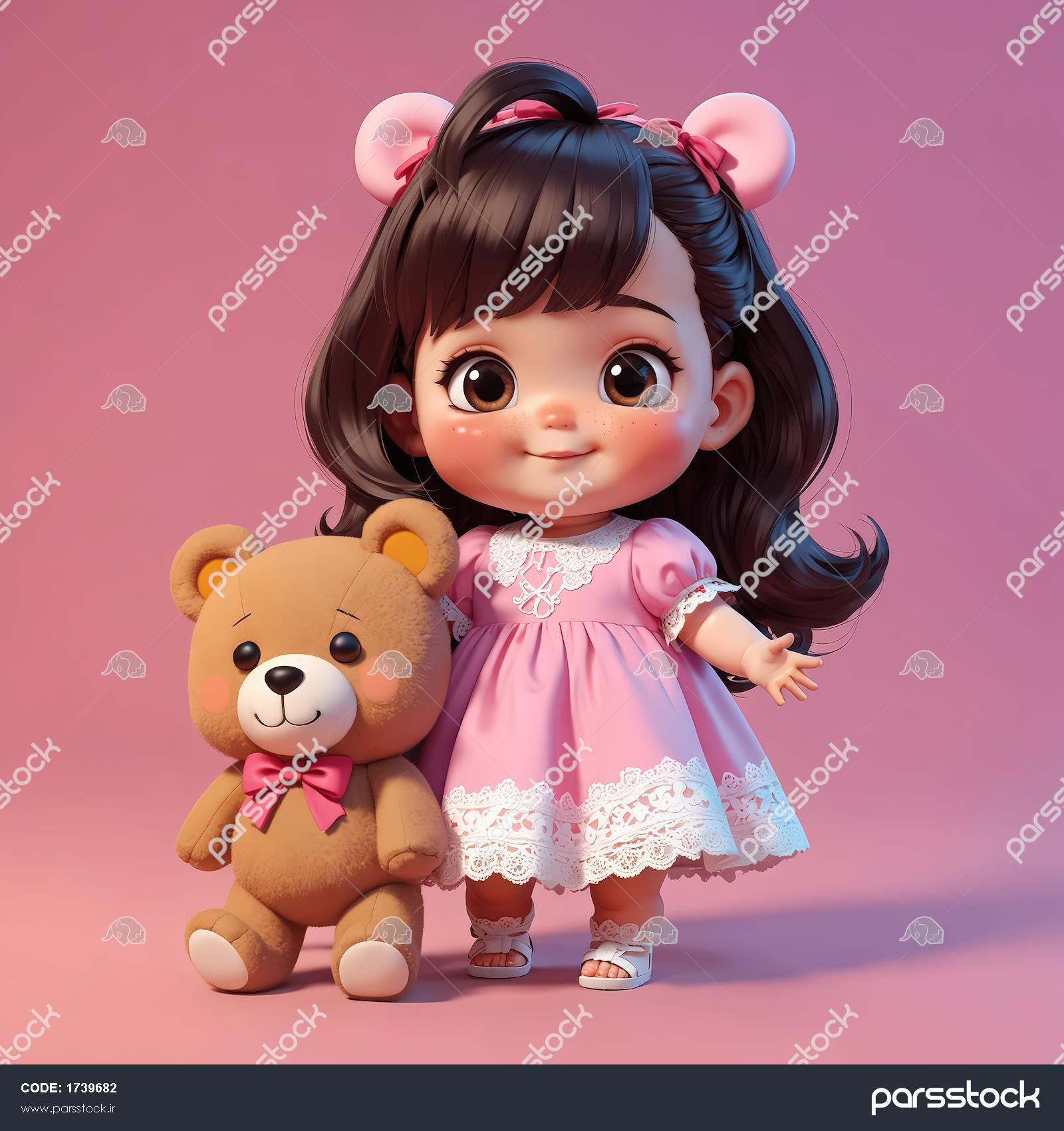 تصویر دکوراتیو دختر کارتونی با لباس صورتی و گوش‌های خرسی، در کنار خرس تدی بزرگ برای طراحی اتاق