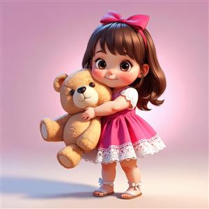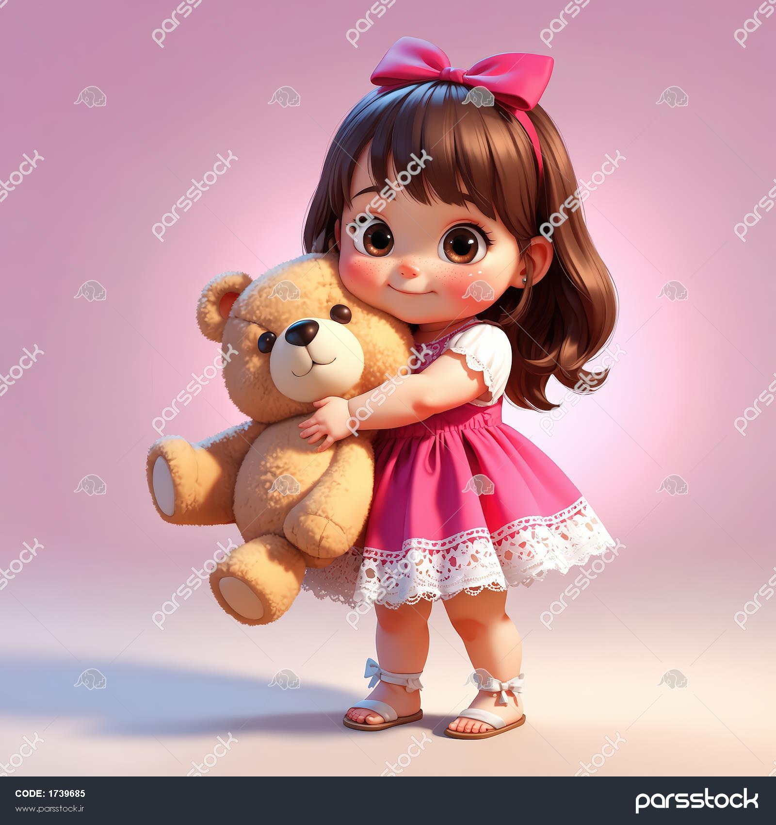 عکس باکیفیت بالا از دختر کارتونی خندان با پیراهن سرخابی و پاپیون بزرگ، در آغوش گرفتن خرس عروسکی