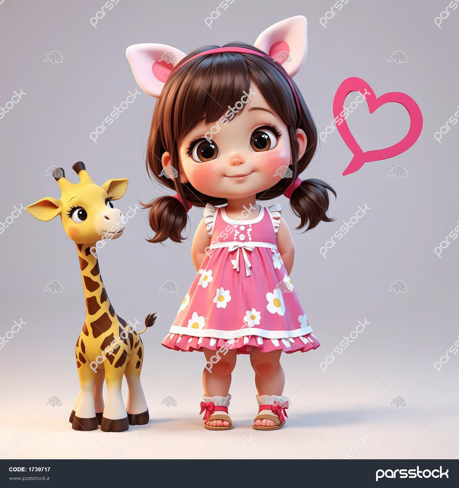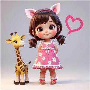 طرح سه‌بعدی کودک با گوش‌های خوک و لباس گلدار صورتی در کنار زرافه عروسکی، همراه با حباب قلب