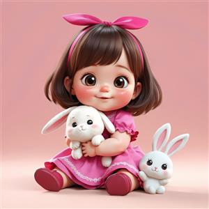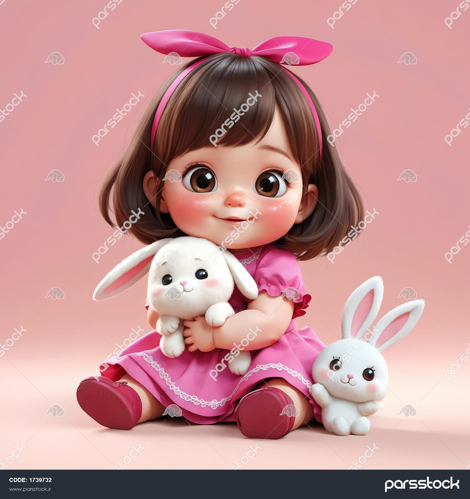 تصویر انیمیشنی دختر کودک نشسته با دو خرگوش عروسکی سفید، طرحی شاد و روشن برای تابلوی دکوراسیون