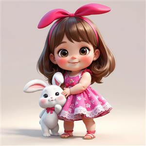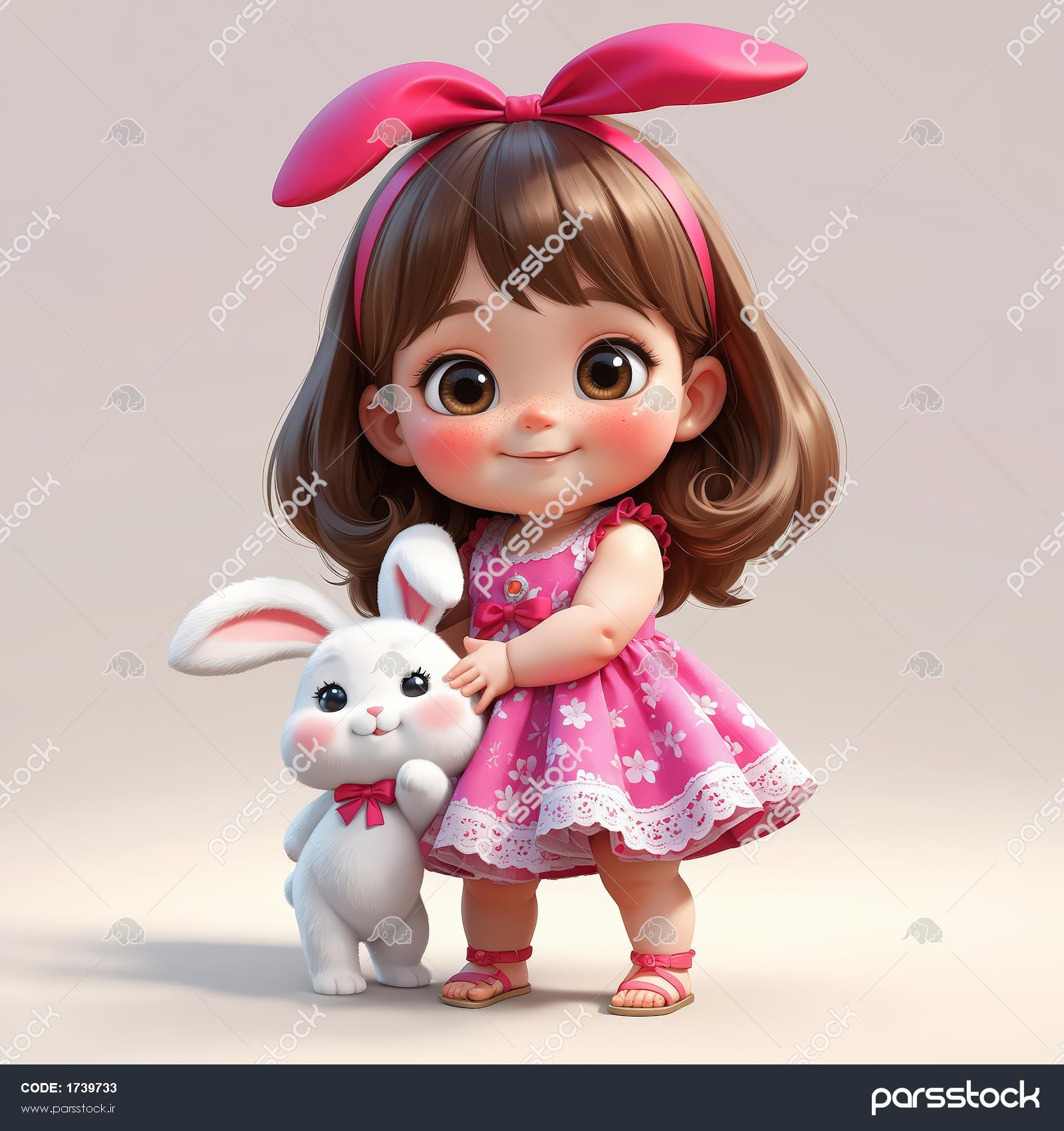 تصویر وکتور سه‌بعدی دختر بچه با پیراهن طرحدار و هدبند پاپیونی در کنار عروسک خرگوش، برای چاپ پوستر
