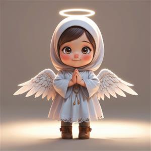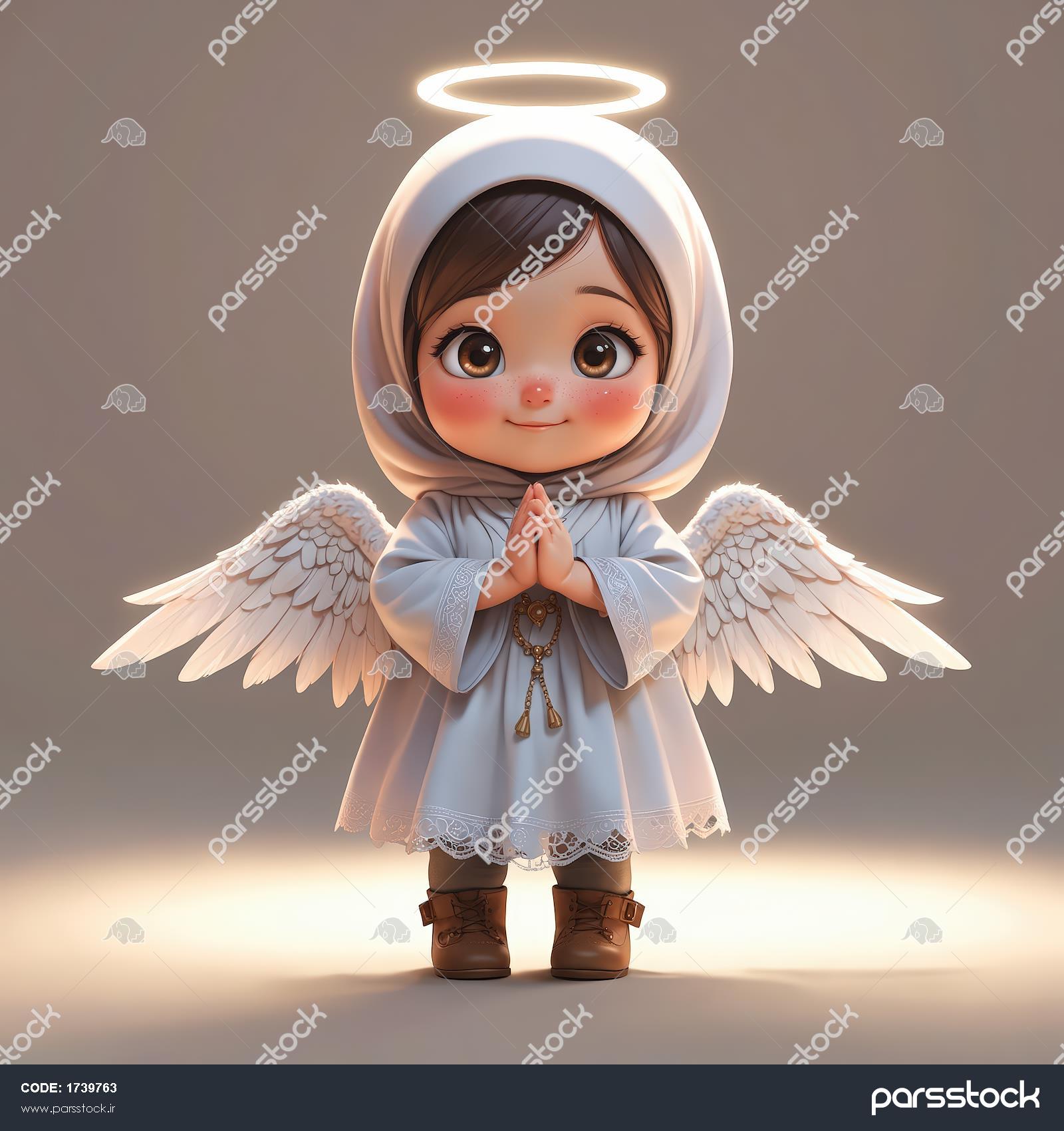 کاراکتر سه‌بعدی فرشته دختر محجبه با لباس طوسی و حجاب سفید، ایستاده (مفهوم پاکی و معصومیت)