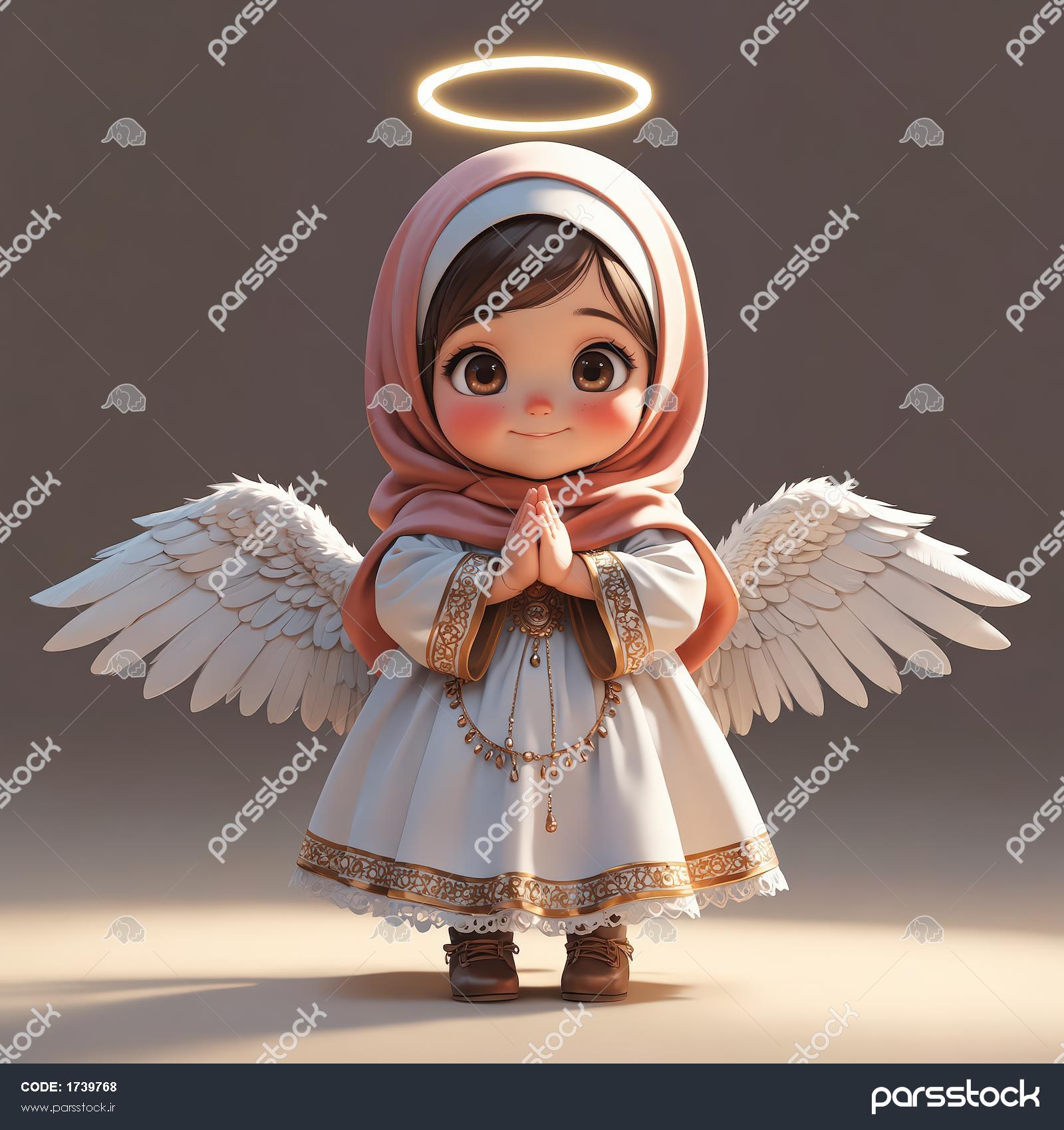 عکس باکیفیت فرشته دختر محجبه با حجاب صورتی، ایستاده در حال دعا (مناسب جشن تکلیف و پوستر)