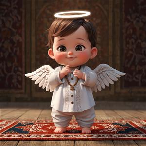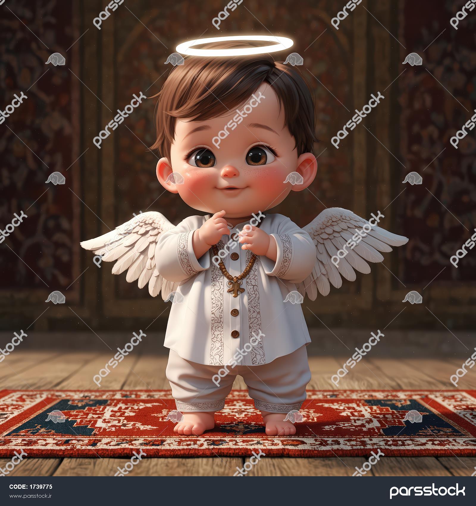 کاراکتر کارتونی پسر بچه فرشته با لباس سنتی سفید و گردنبند، ایستاده روی فرش ایرانی (عکس اورجینال با کیفیت