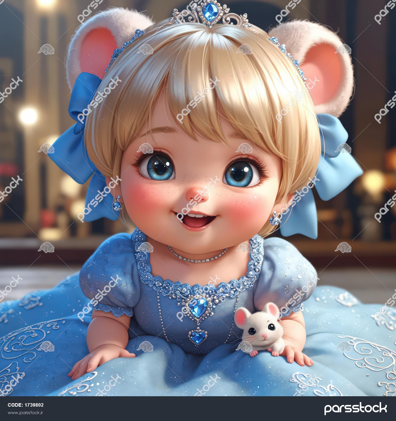 تصویر چهره کلوزآپ کودک پرنسس موش با لباس و پاپیون آبی برای چاپ نوزادی