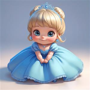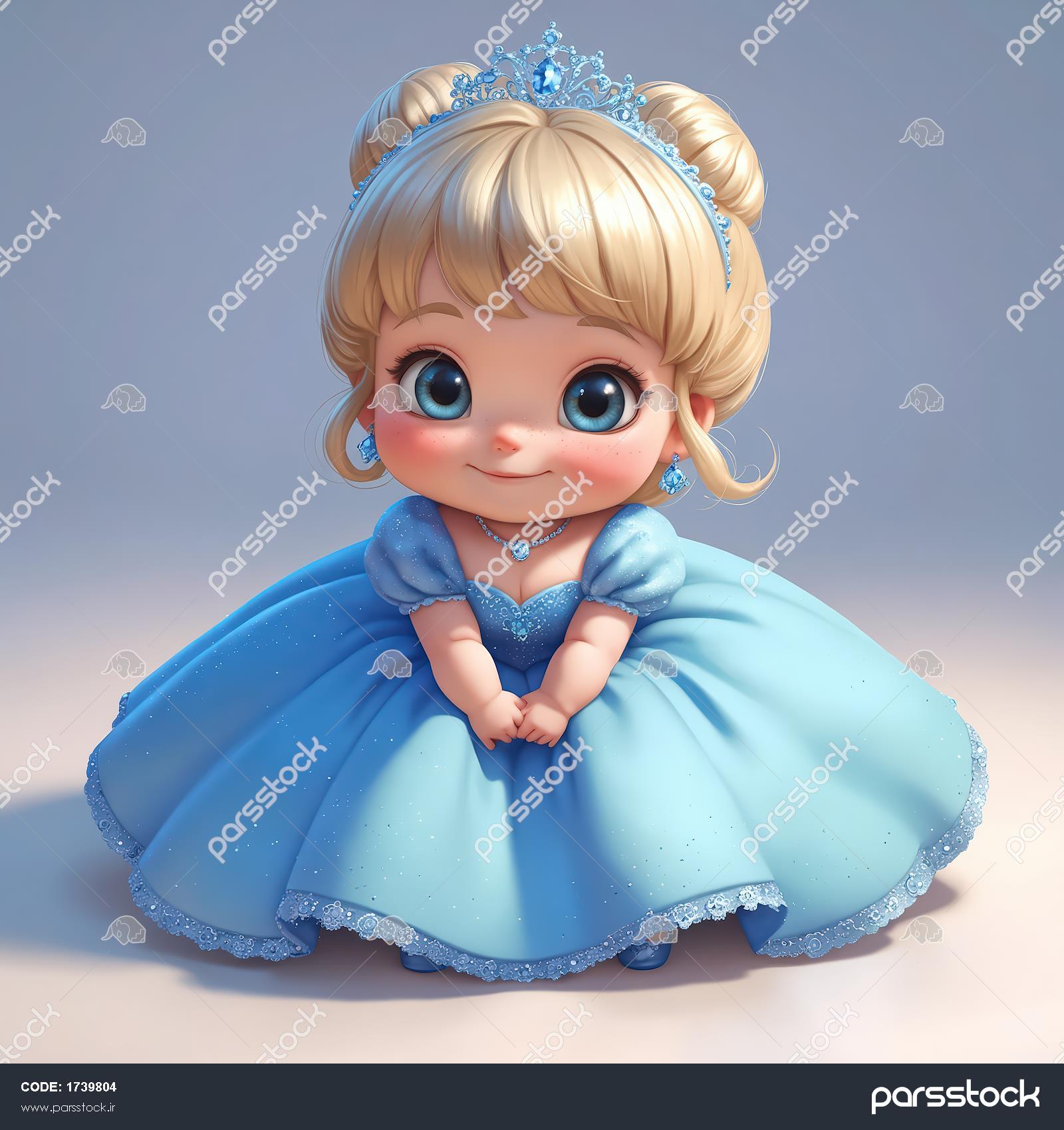 تصویر کلوزآپ کودک پرنسس با لباس آبی و تاج نشسته با دست‌های به هم گره‌خورده