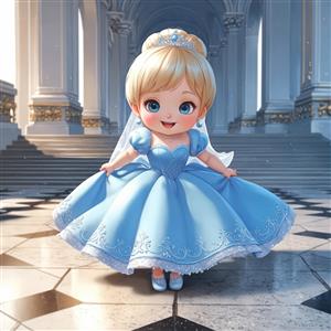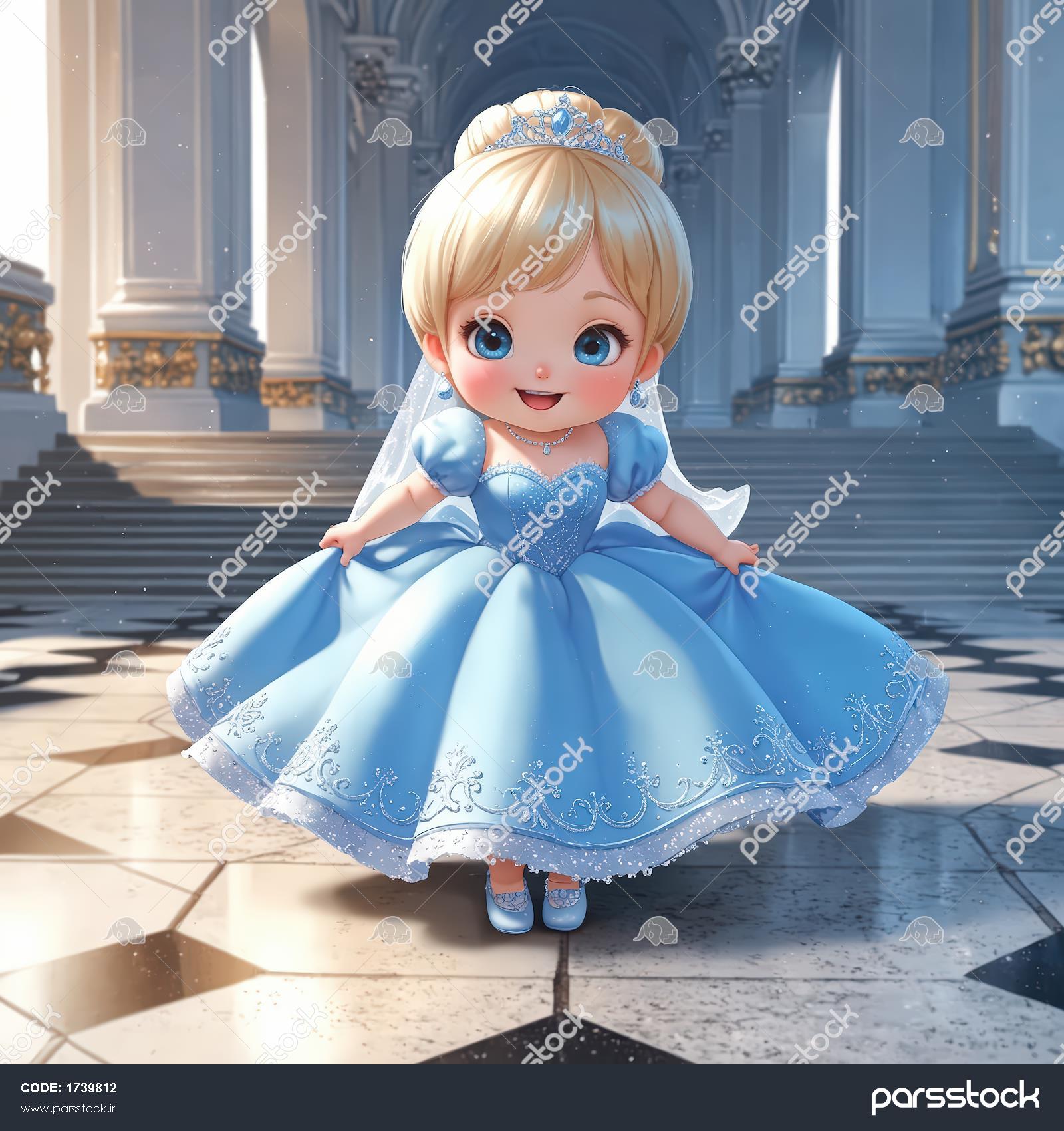 پرنسس کارتونی با موهای گوجه‌ای و لباس آبی در مقابل ستون‌های قصر و نخل‌ها
