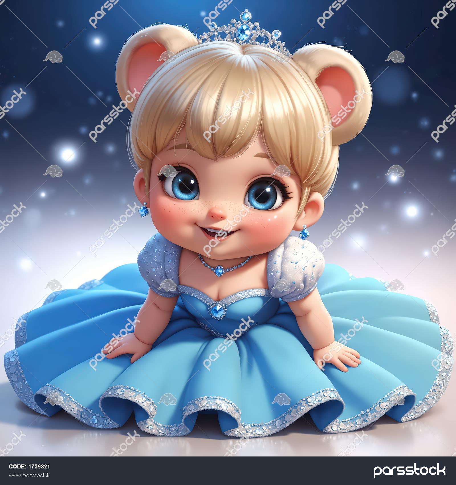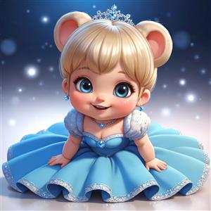 تصویر کلوزآپ کودک پرنسس موش با لباس مجلسی آبی و پس‌زمینه ستاره‌ای (جشن)