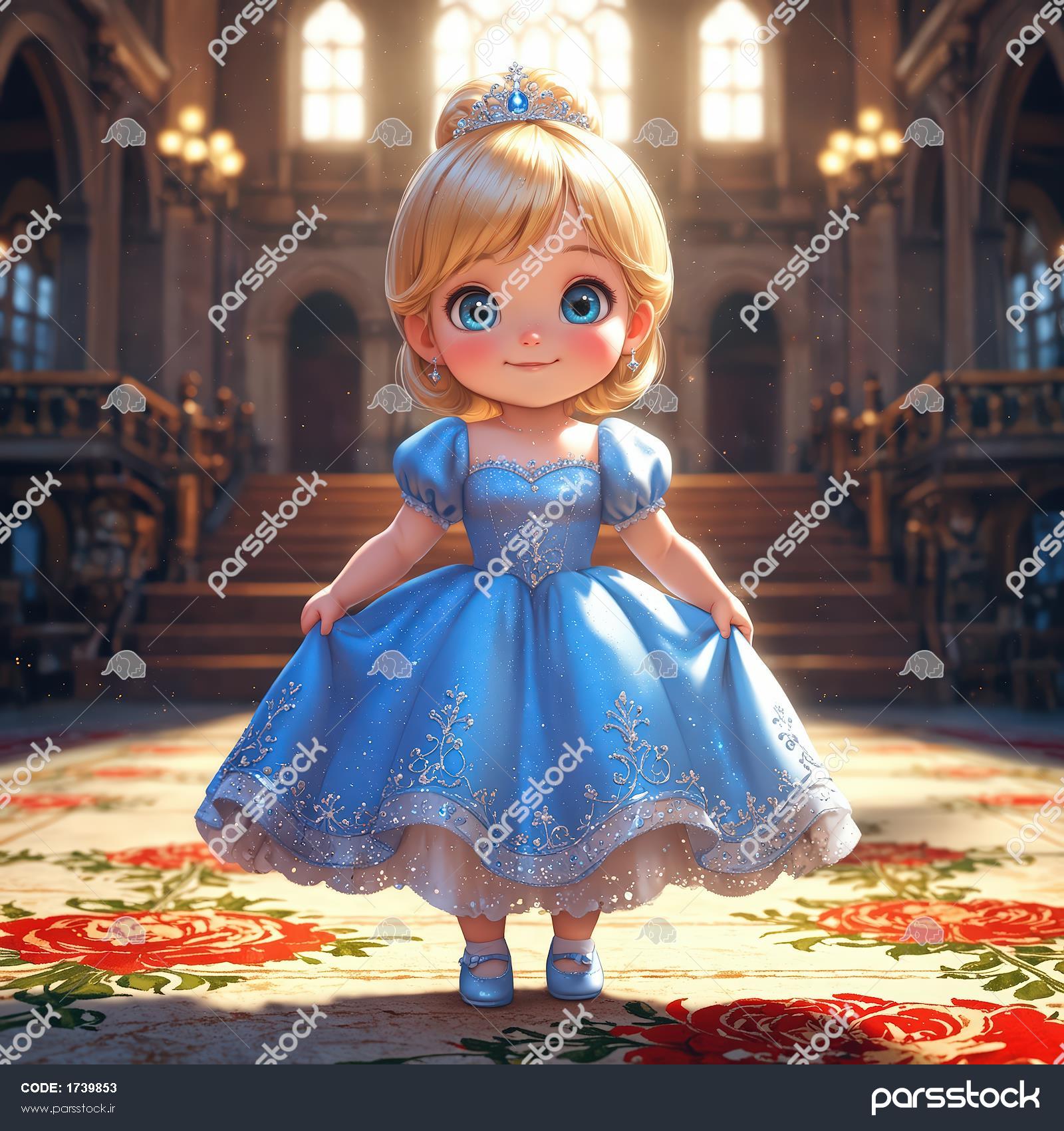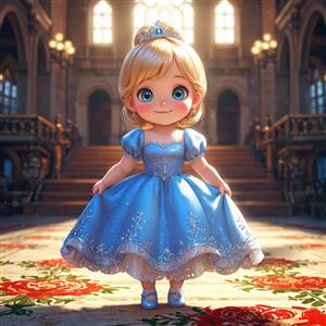 تصویر پرنسس سیندرلا در سالن قصر با فرش گل رز و پله‌های چوبی