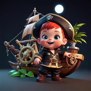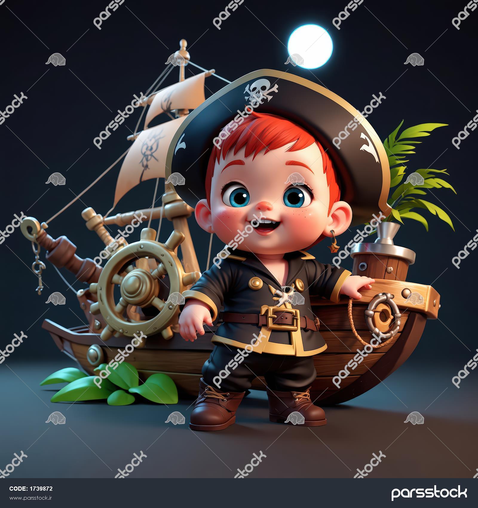 کارتون بچه‌ دزد دریایی با موی قرمز کنار کشتی و ماه کامل