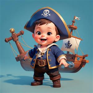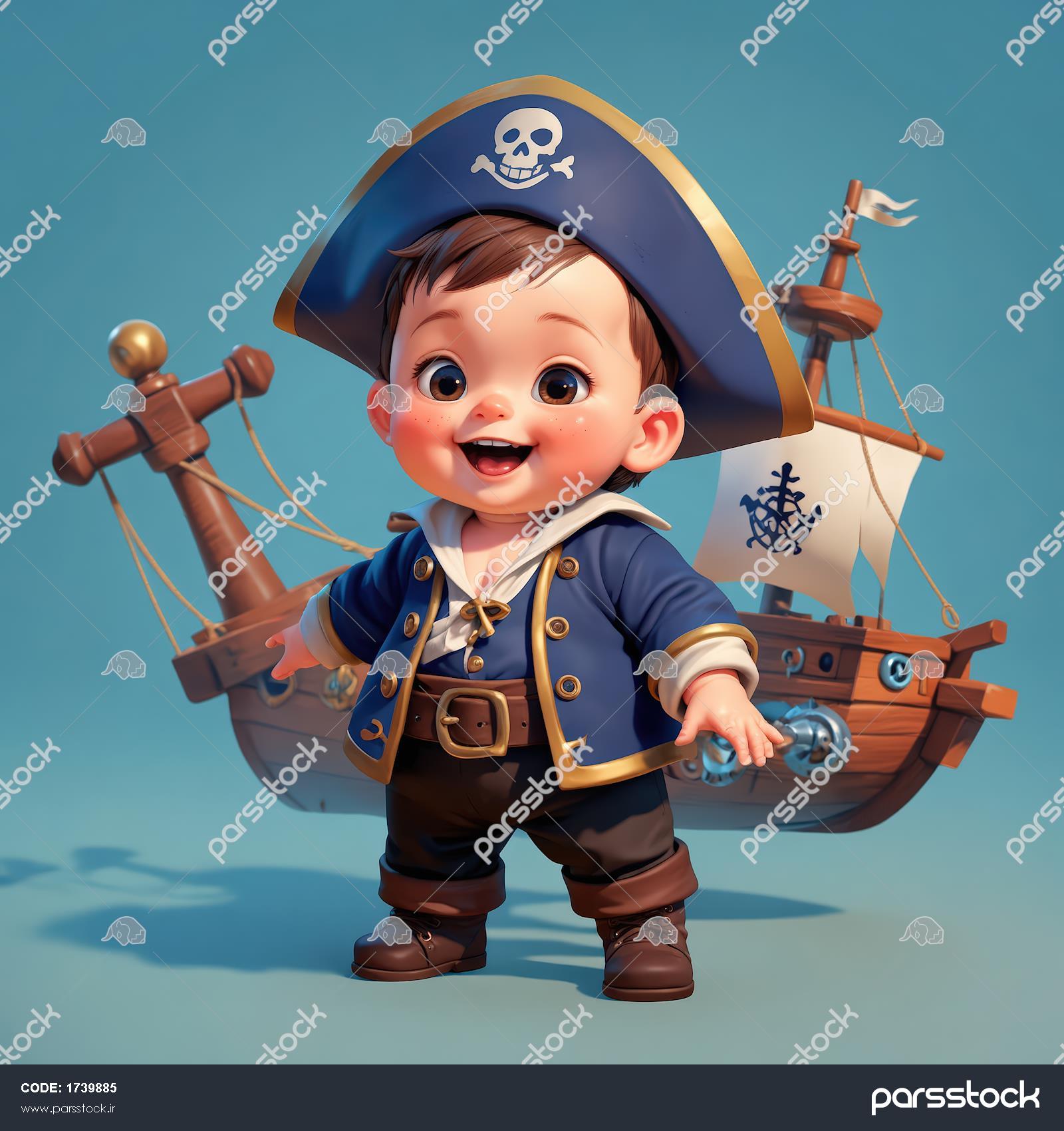 تصویر کودک دزد دریایی با لباس آبی و کلاه جمجمه، ایستاده در جلوی کشتی بادبانی لنگردار