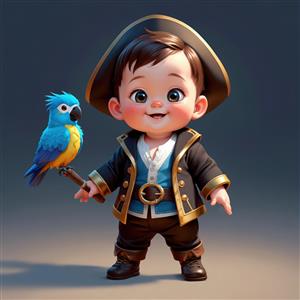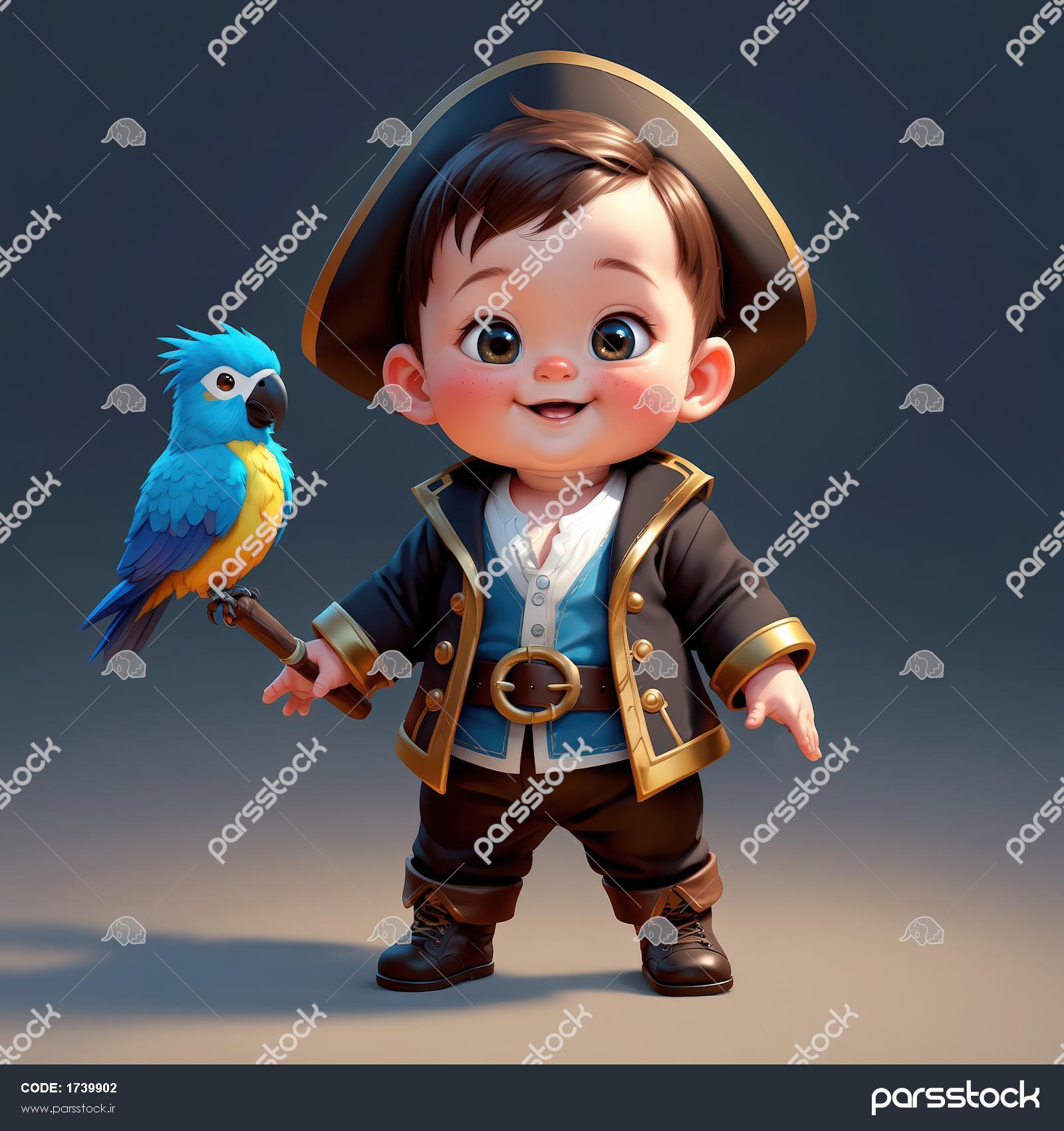 عکس دزد دریایی بامزه نوزاد با طوطی آبی و زرد روی عصا، با کت سرمه‌ای و طلایی در محیط استودیوئی