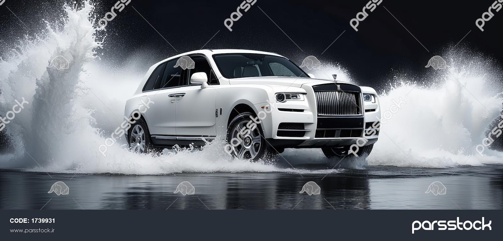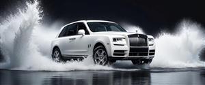 رولز رویس کالینان سفید در حال گذر انفجاری از میان موج‌های خروشان آب، تصویر با کنتراست بالا