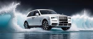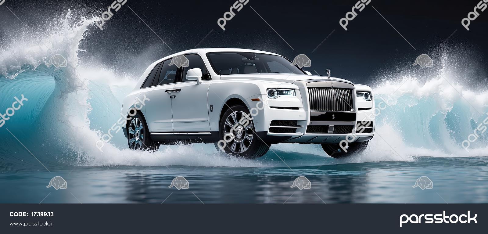 رولز رویس کالینان سفید در حال عبور قدرتمند از موج بزرگ آب، طراحی سه‌بعدی و لوکس