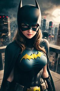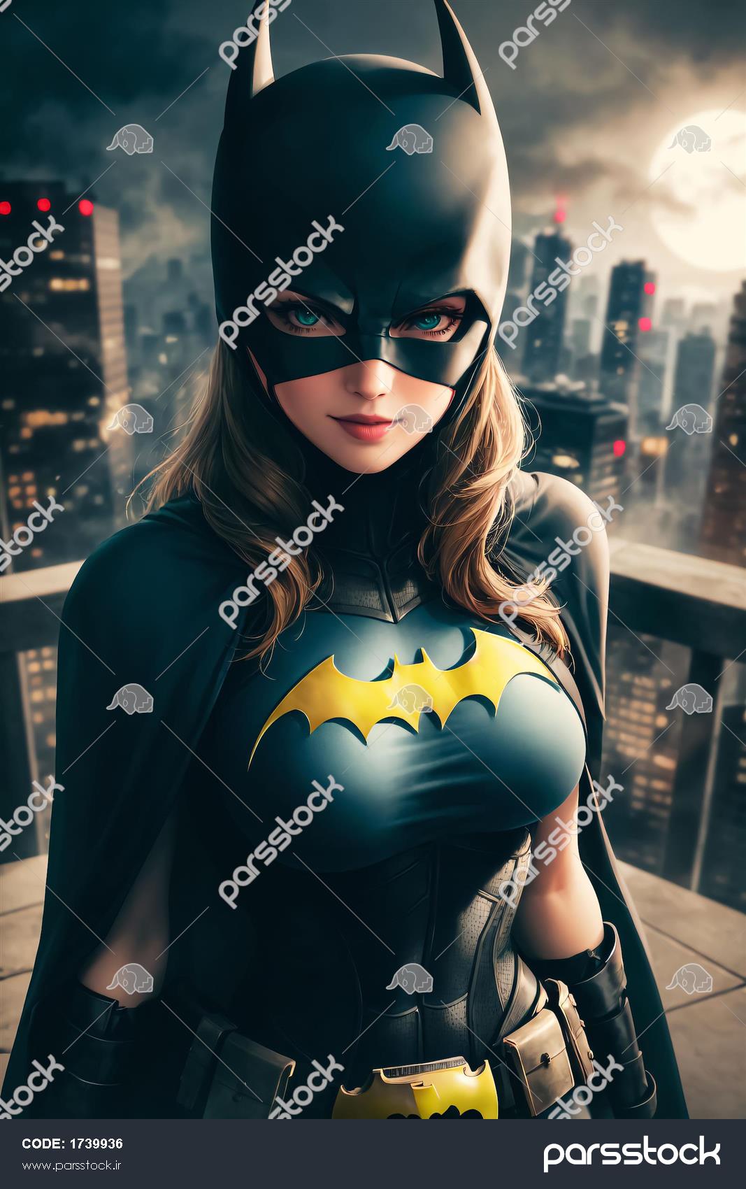 پرتره زن خفاشی با پس‌زمینه ابرشهری و ماه کامل، مناسب پوستر دکوراتیو