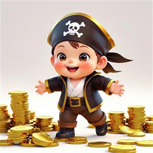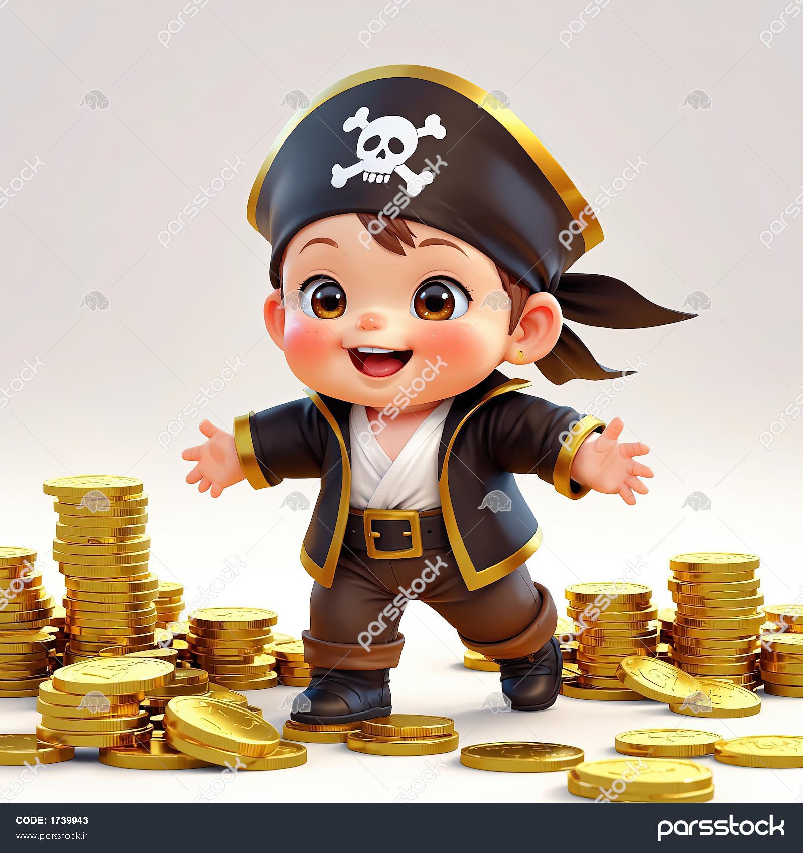 تصویر سئو کودک دزد دریایی در حال راه رفتن روی سکه‌های طلا برای محصولات چاپی