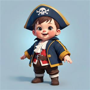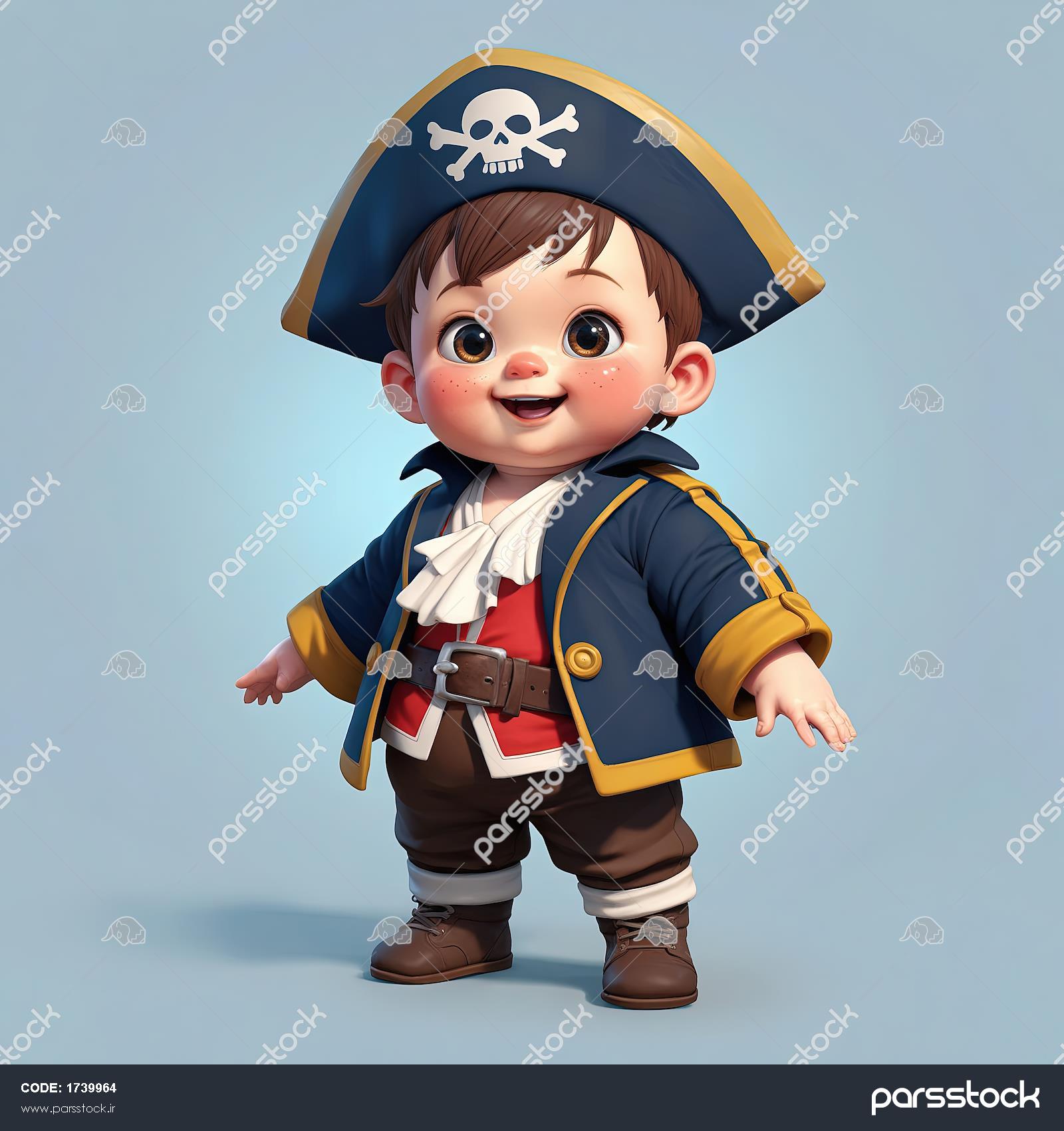 شخصیت سه‌بعدی کودک کاپیتان با لباس رسمی سرمه‌ای و پیراهن سفید یقه‌دار، کلاه با نشان اسکلت