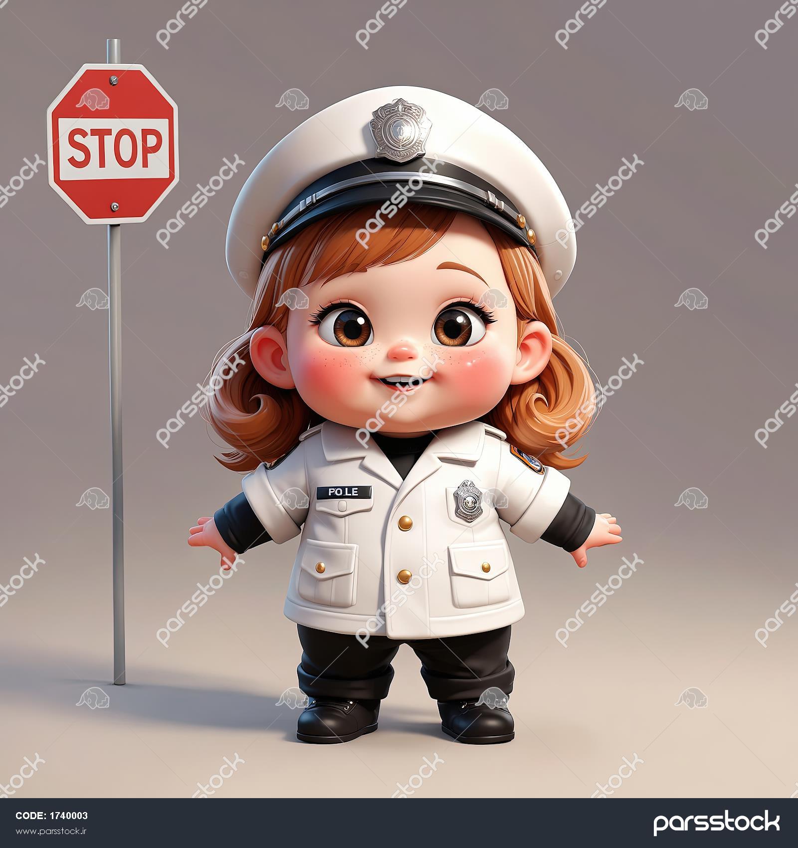 تصویر گرافیکی عروسک دختر پلیس با یونیفرم سفید، علامت ایست هشت ضلعی و موهای خرمایی