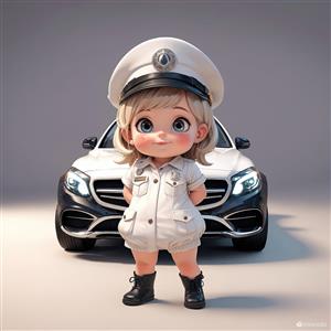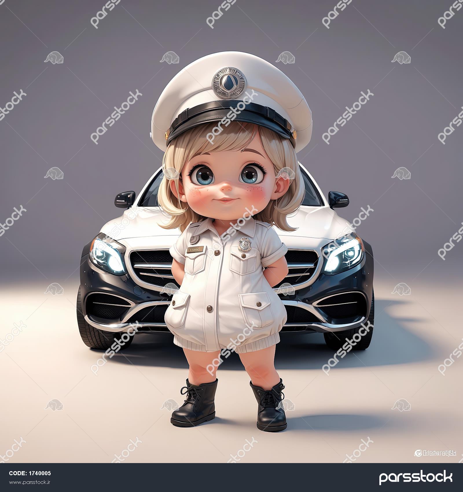 تصویر لارج‌فرمت عروسک دختر پلیس بلوند با لباس بادی سفید و خودرو شاسی بلند پلیس