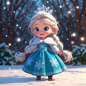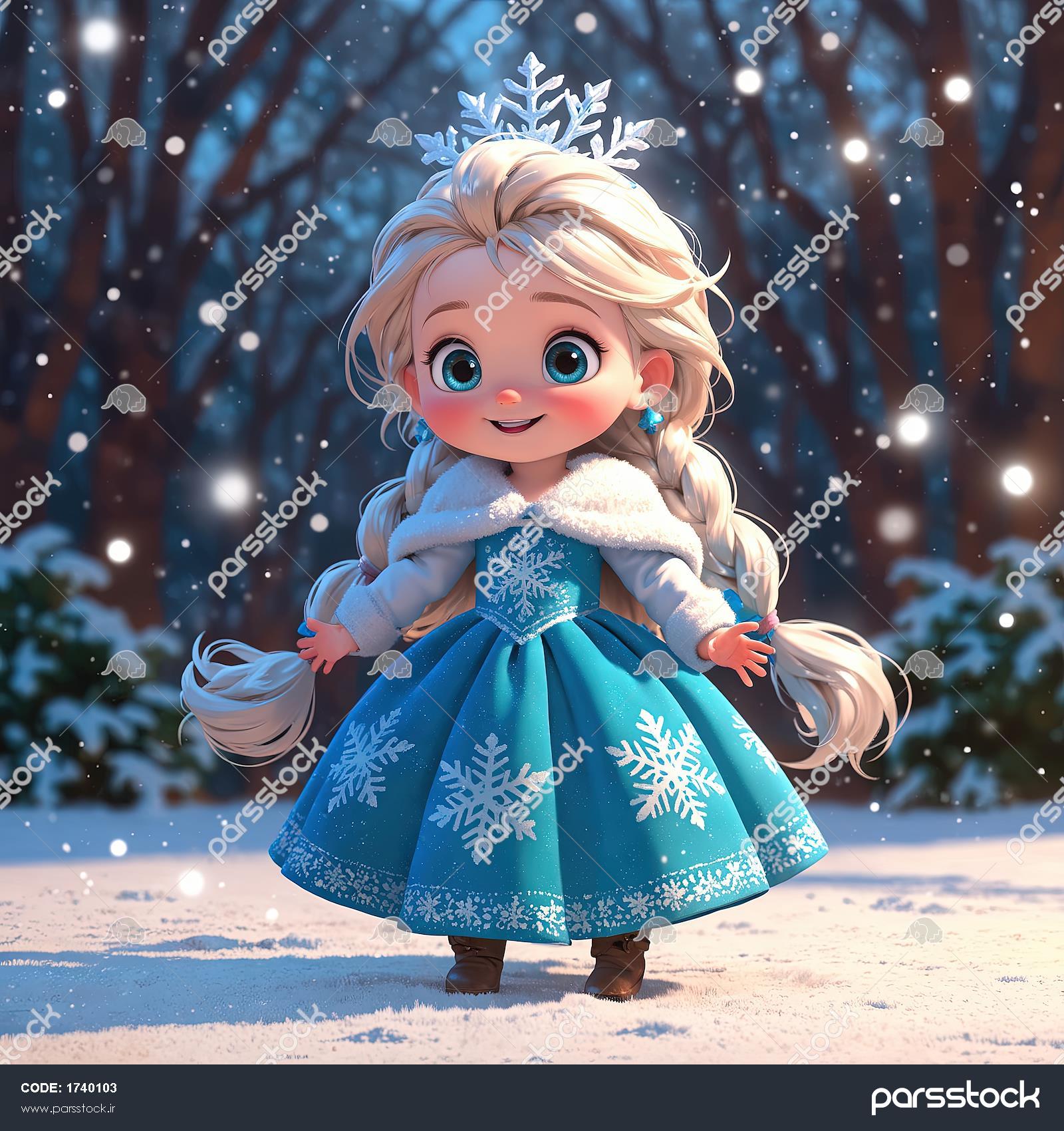 پرنسس السای خندان: تصویر فانتزی با تاج دانه برف و پس‌زمینه درختان تیره در شب برفی