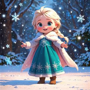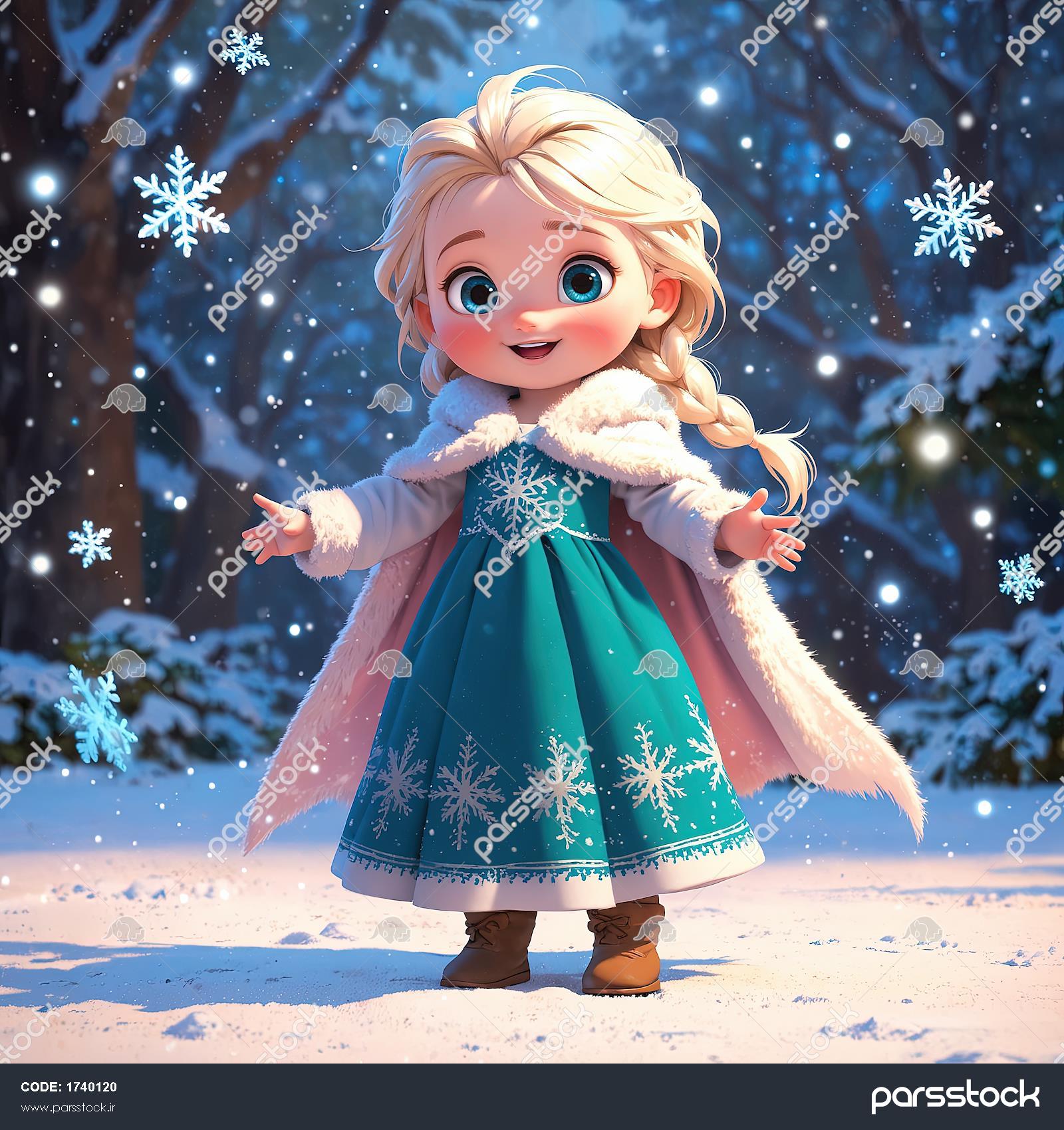 تصویر سه بعدی السای کودکانه با لباس آبی توری و آستین گیپور در باغ شکوفه‌های صورتی