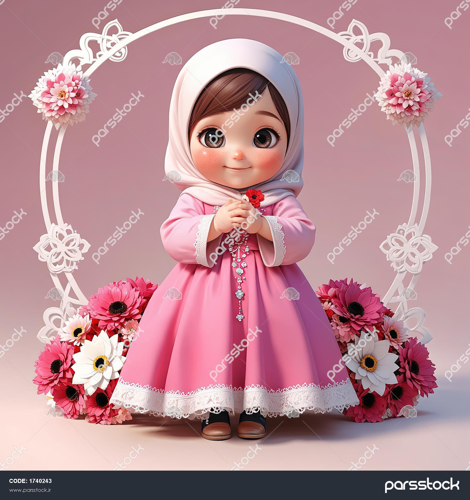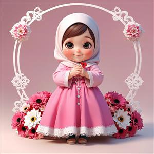 دختر بچه کارتونی باحجاب، با لباس صورتی و گل، ایستاده در قاب گلی توری، تصویرسازی