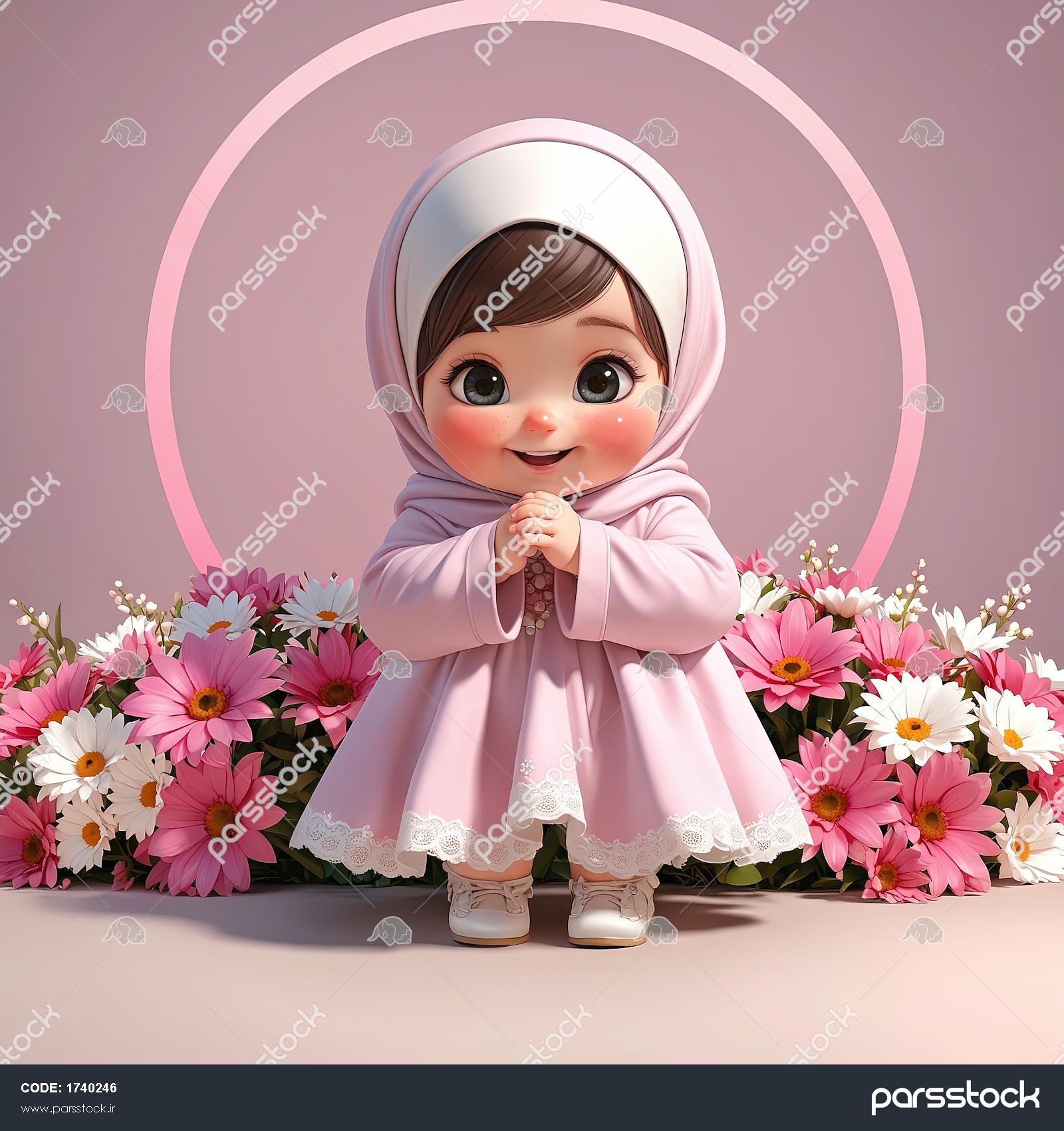 دختر بچه کارتونی باحجاب صورتی، شاد، ایستاده میان گل‌های بهاری، تصویرسازی