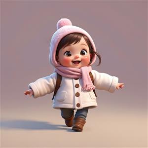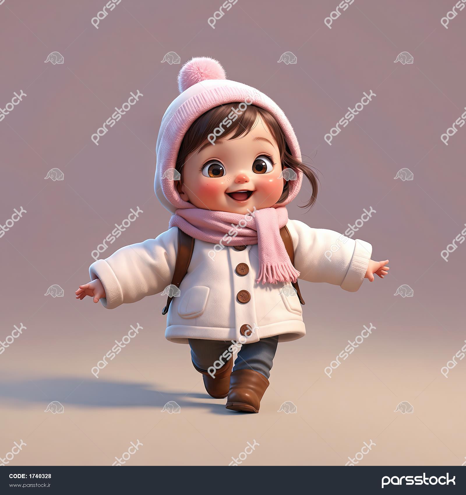 تصویر عروسک کودک با پالتوی سفید، کلاه پوم‌پوم‌دار و در حال دویدن