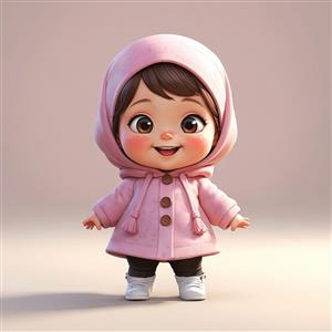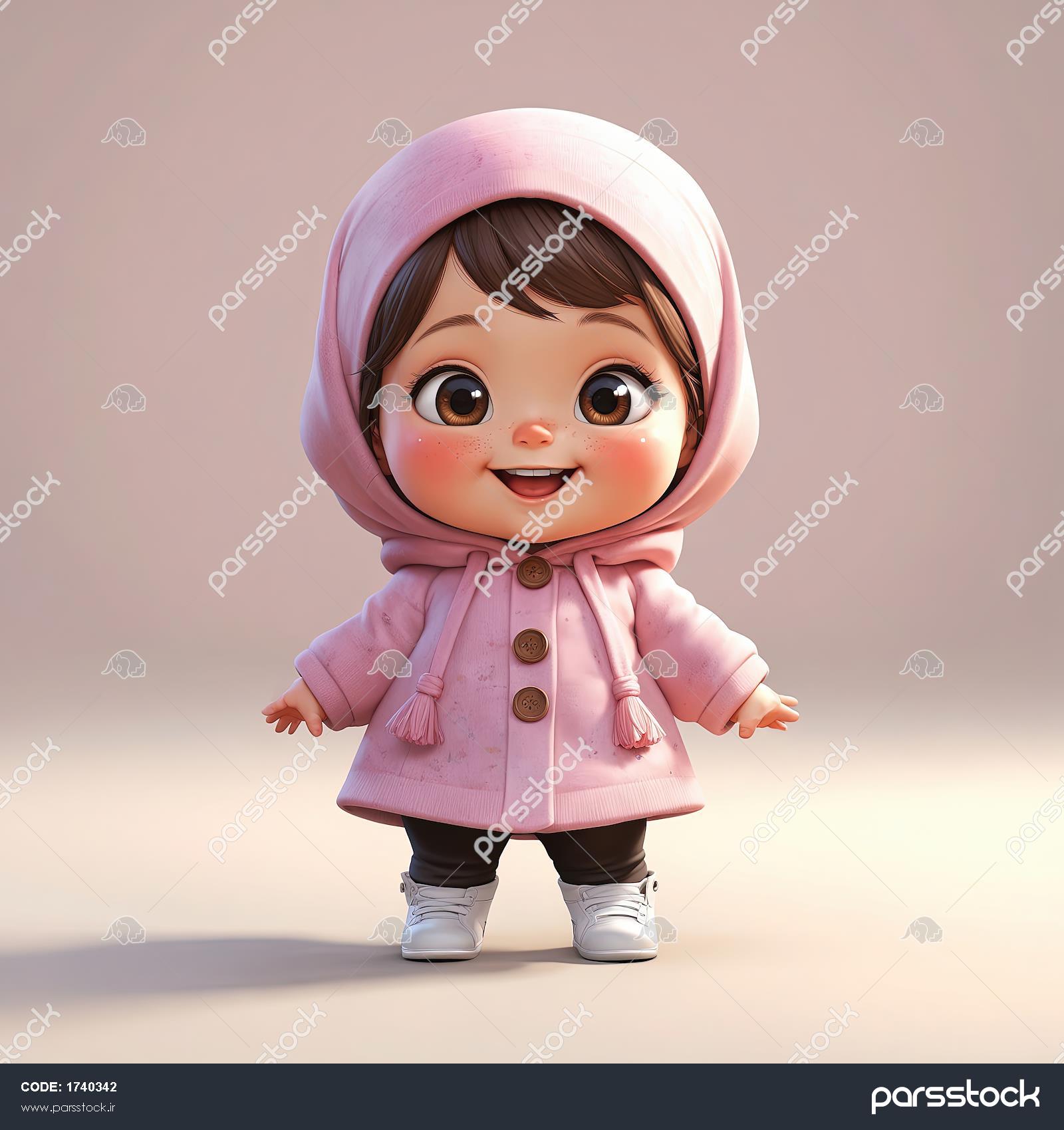 تصویر کارتونی کودک با کلاه و پالتوی صورتی دکمه‌دار و شلوار تیره