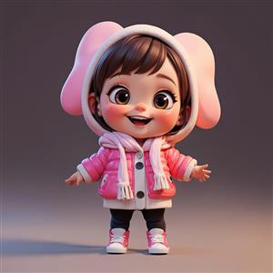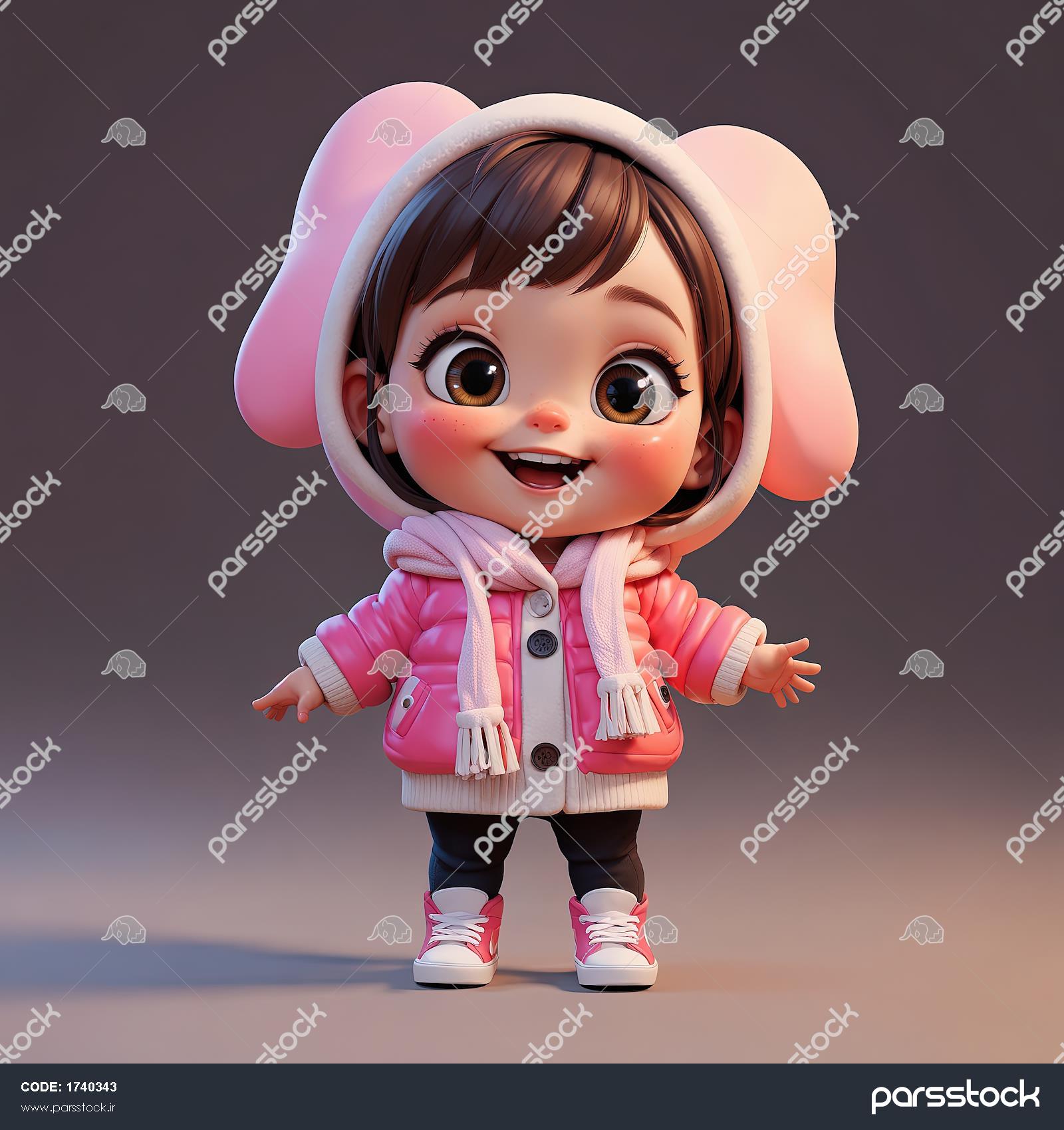 وکتور سه‌بعدی دختر با کلاه گوش بلند خرگوشی و کاپشن صورتی پفی زمستانی