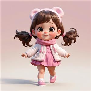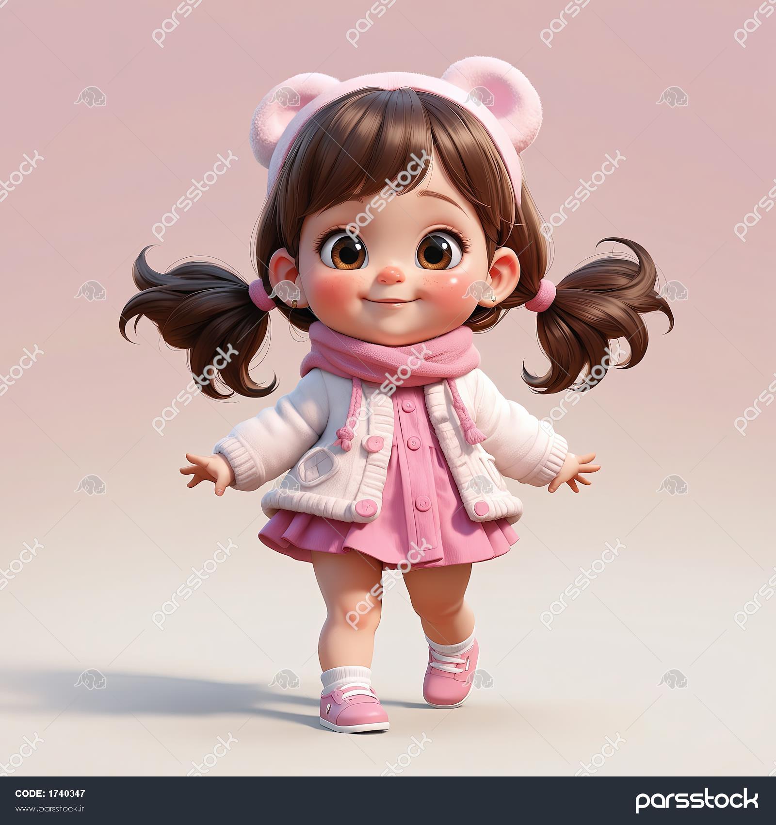 وکتور سه‌بعدی دختر با مدل موی دم اسبی، کلاه خرسی و لباس مینی‌اسکرت صورتی