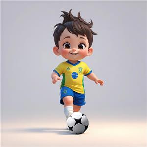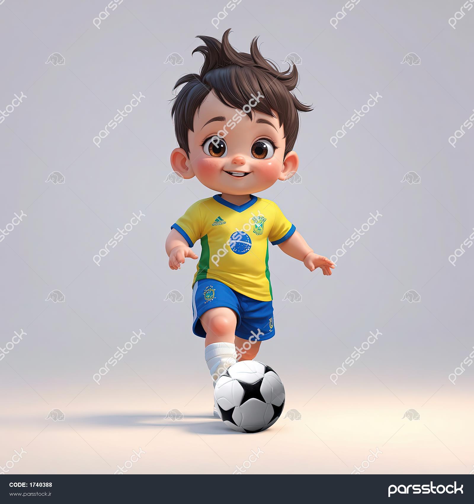 تصویر کودک فوتبالیست برزیلی با لباس زرد و آبی، در حال دریبل جذاب توپ
