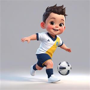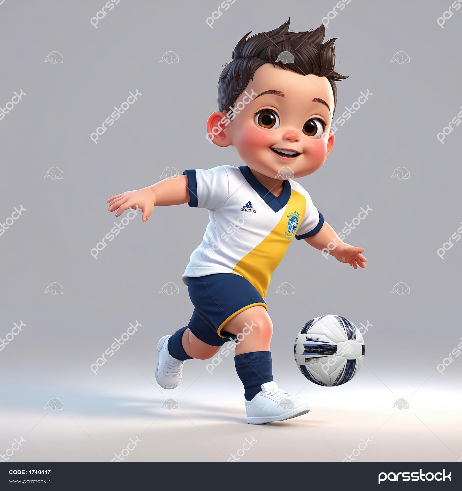 تصویر بامزه کودک فوتبالیست با کیت آبی و زرد در حال دریبل زدن، طراحی ۳ بعدی