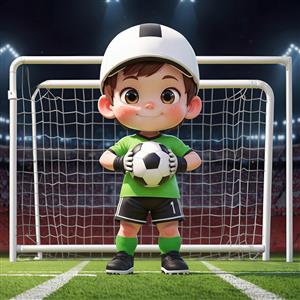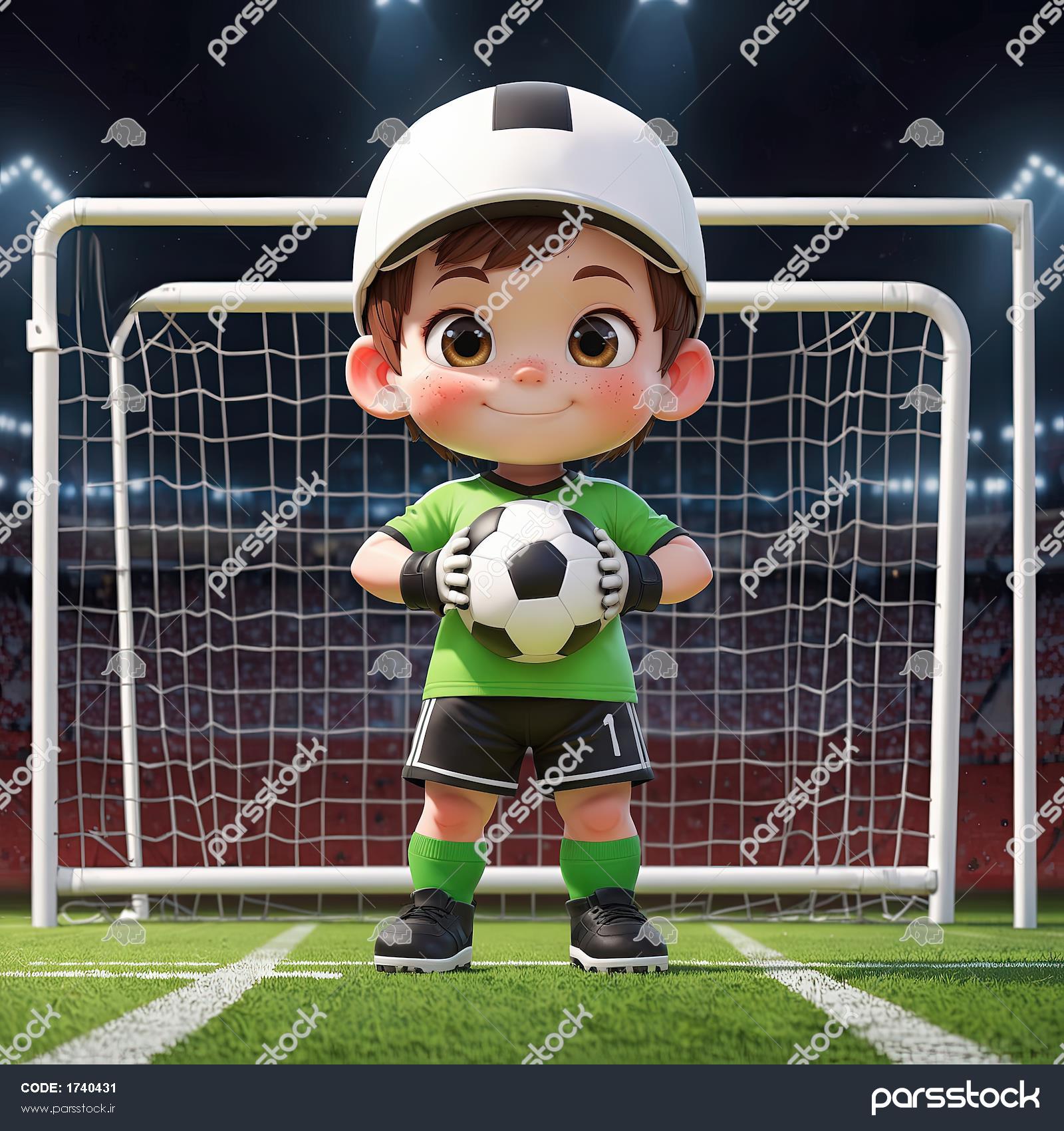 تصویر دروازه‌بان فانتزی کودک با کلاه سفید و لباس سبز در حال نگه داشتن توپ