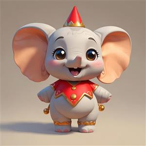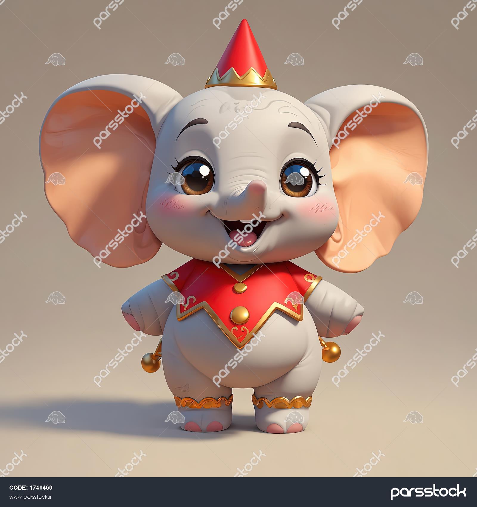 فیل کارتونی با کلاه سیرک قرمز و لباس طلایی و قرمز (تم دامبو)