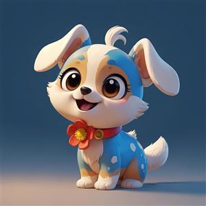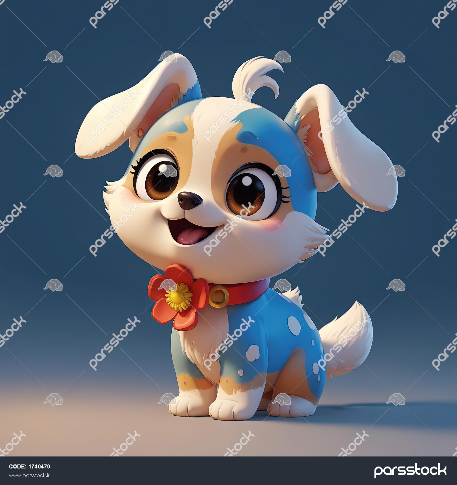 توله سگ کارتونی خالدار آبی و سفید با گل سینه نارنجی و گوش‌های آویزان