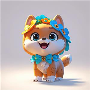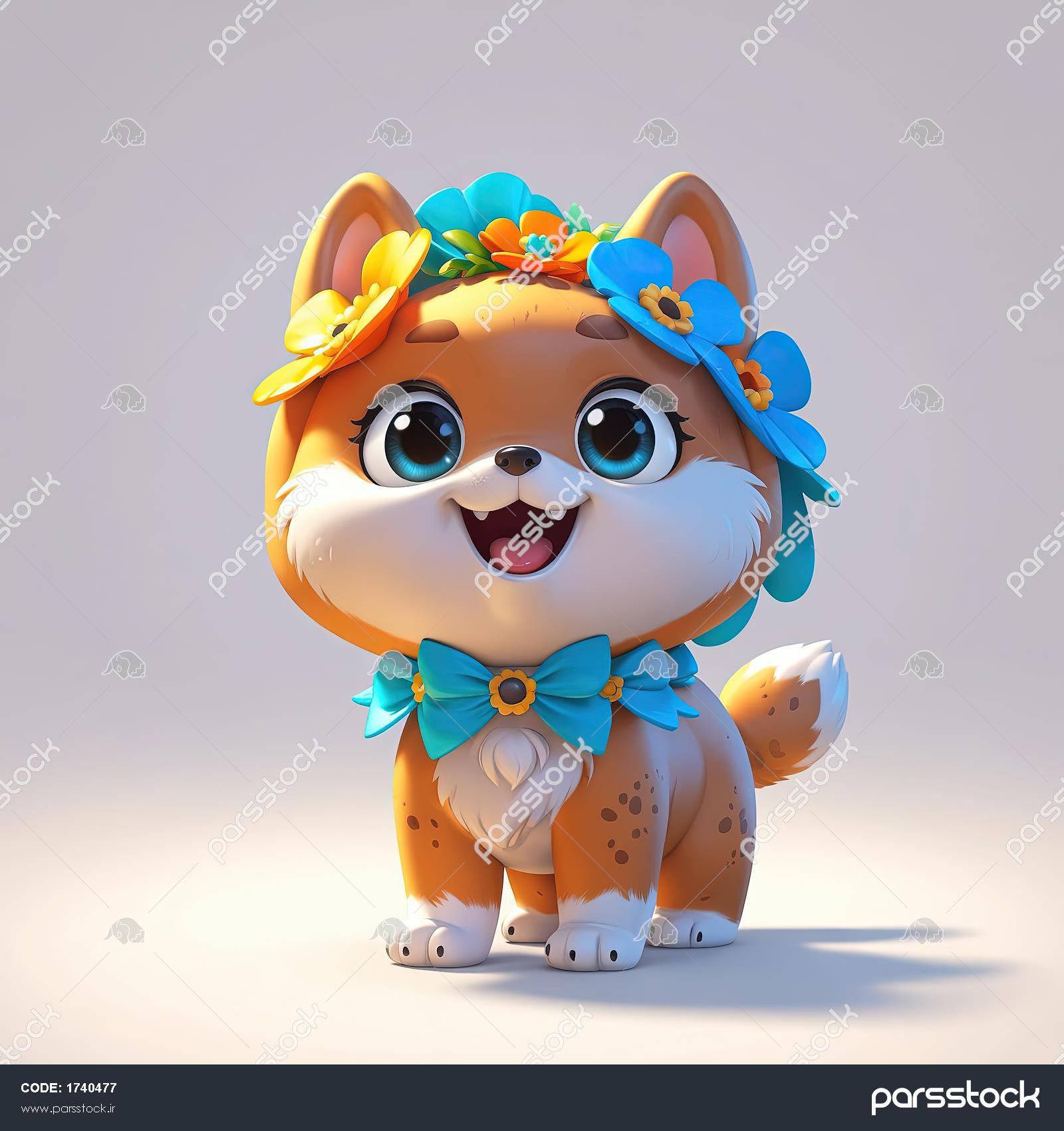 توله سگ کارتونی با تاج گل آبی و نارنجی و پاپیون بزرگ آبی