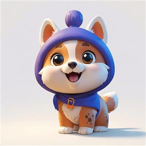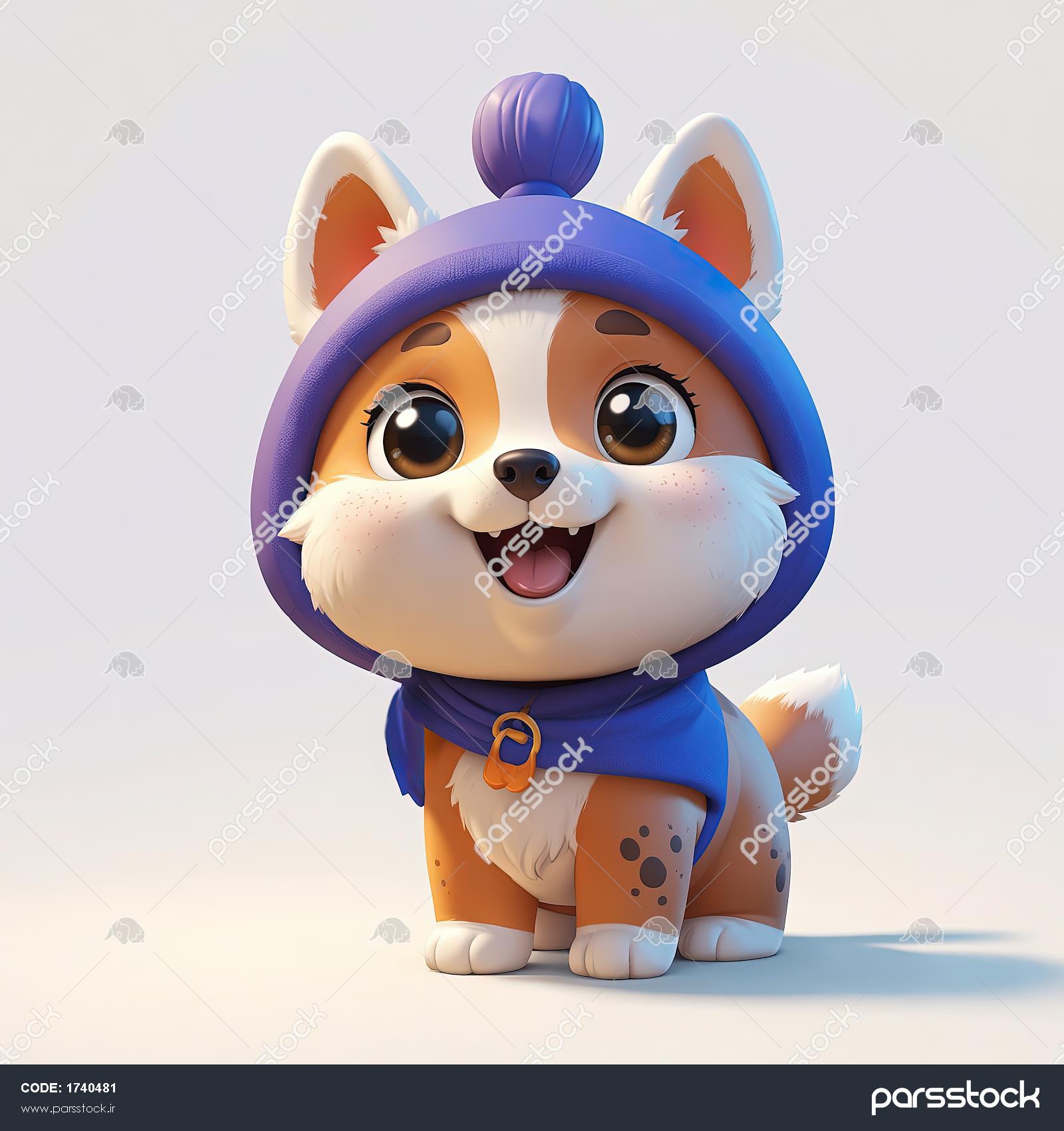 تصویر 3D توله سگ کارتونی با کلاه و شال آبی و بنفش