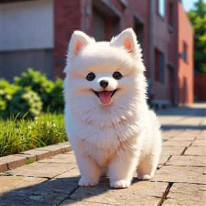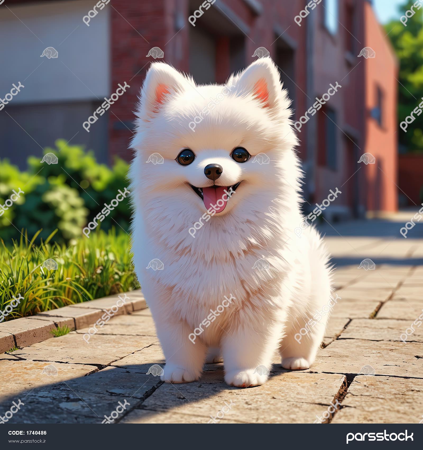 توله سگ پشمالو سفید در پیاده‌روی شهری با آجر و سبزه