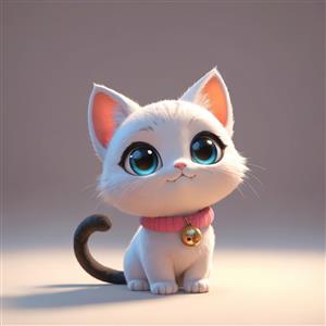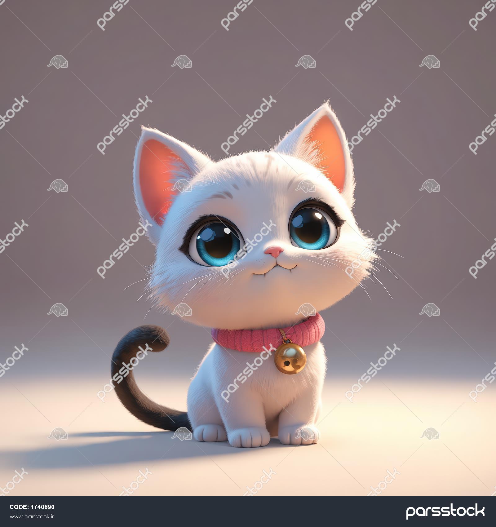 بچه گربه سفید کارتونی با چشمان آبی درخشان، قلاده صورتی و دم تیره