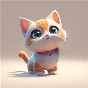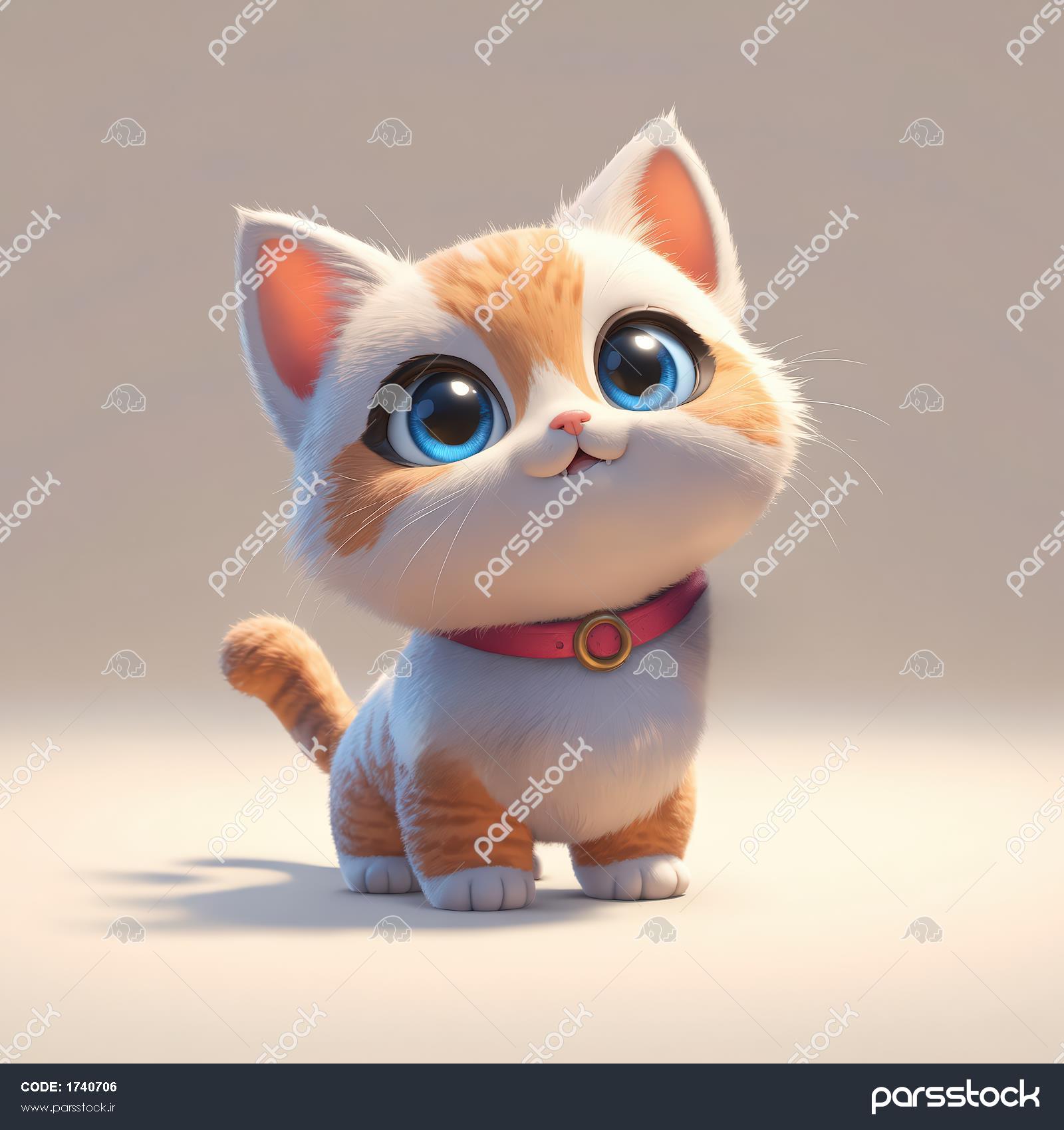 بچه گربه نارنجی و سفید راه راه با چشمان آبی درشت و قلاده صورتی