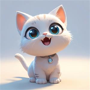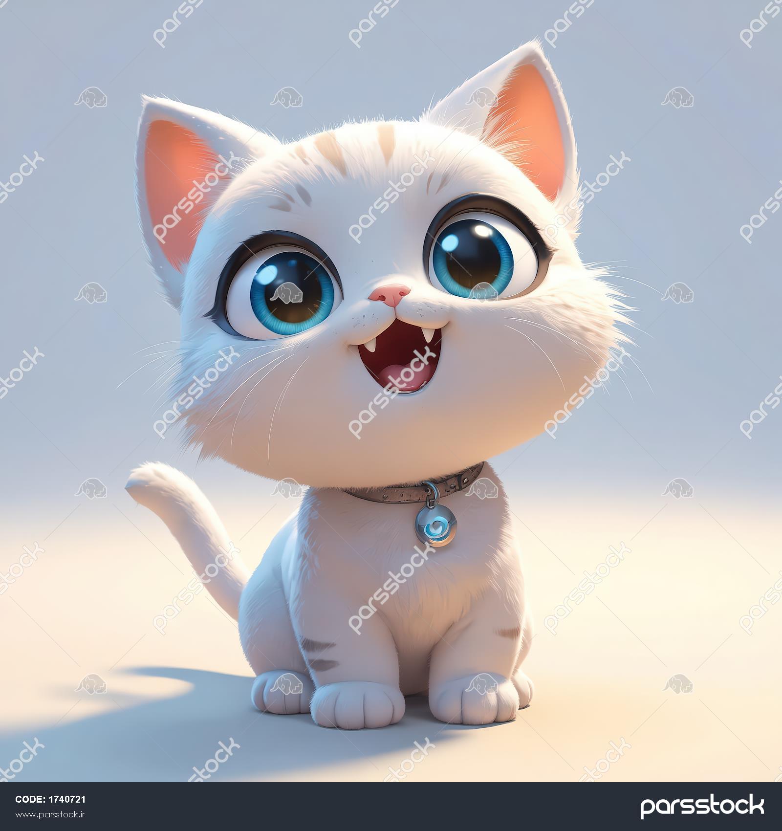 بچه گربه سفید راه راه با چشمان آبی درشت و قلاده خاکستری با آویز الماس