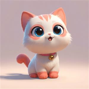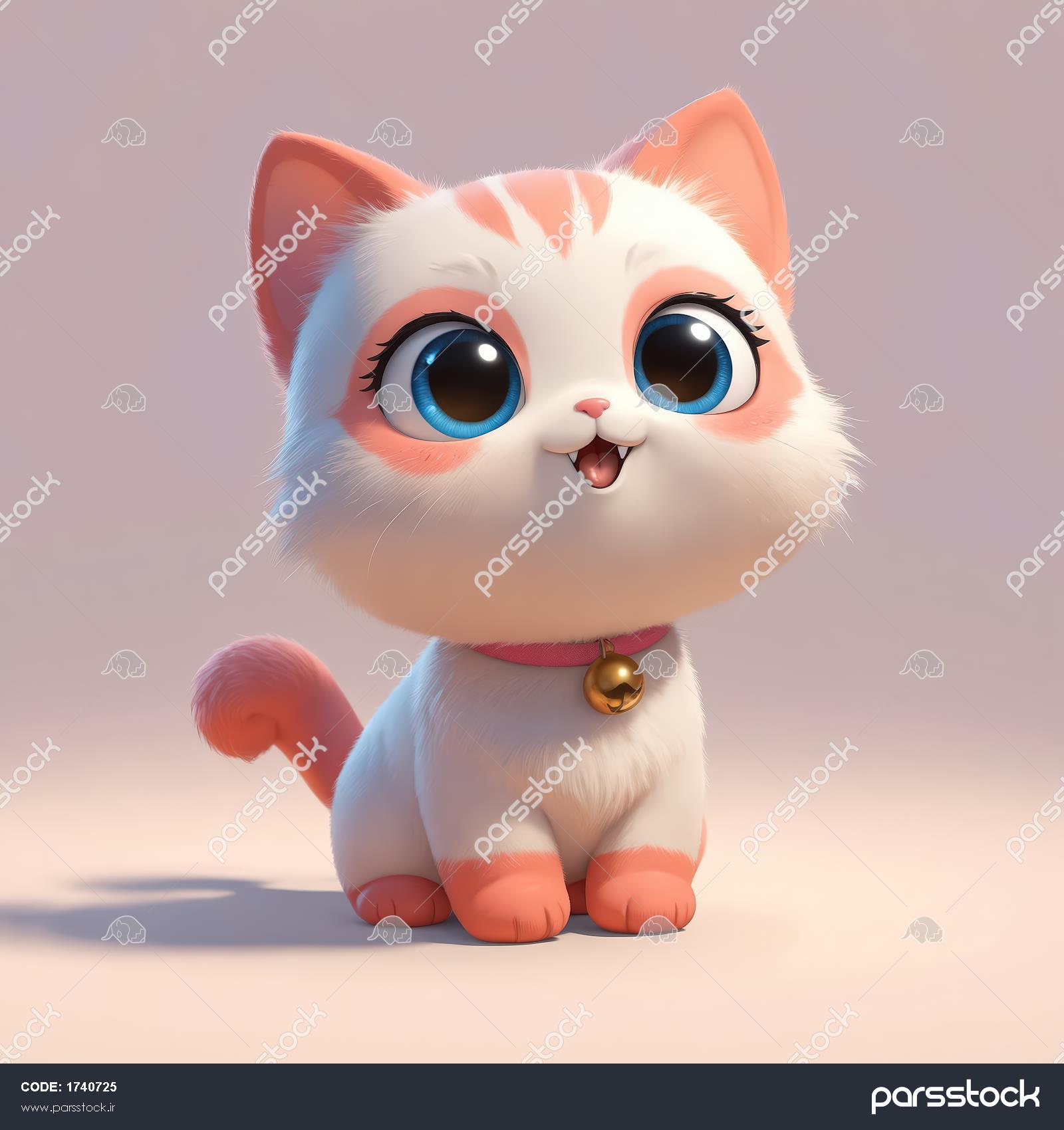 بچه گربه سفید و صورتی کارتونی با چشمان آبی درشت و قلاده زنگوله‌دار