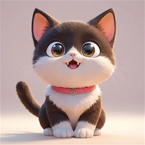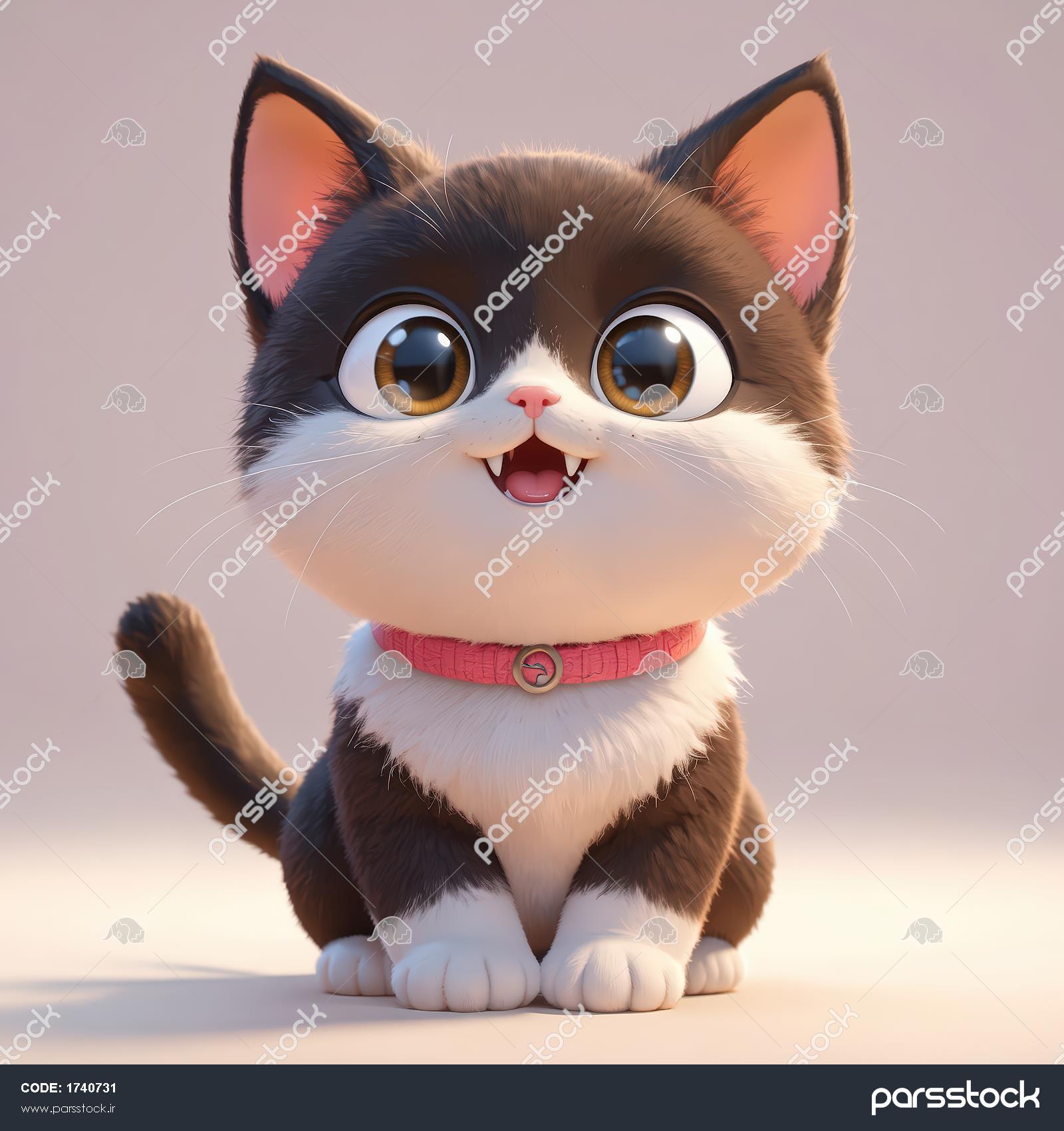 بچه گربه قهوه‌ای و سفید خندان با قلاده صورتی و چشم‌های عسلی درشت
