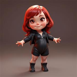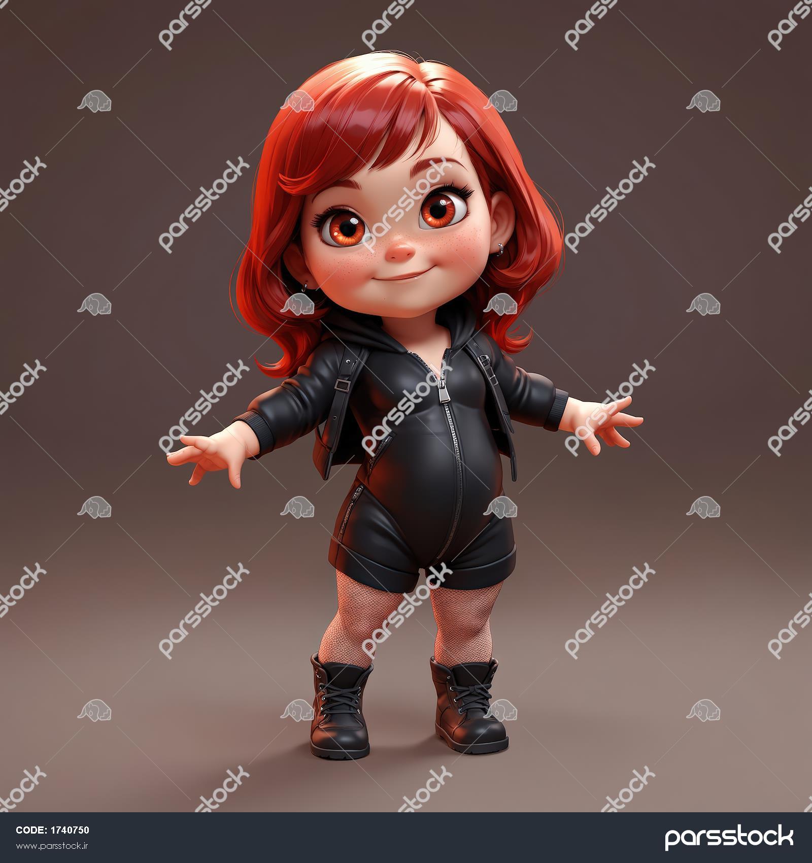 عروسک دختر موتور سوار مو قرمز، لباس چرمی کاپشن‌دار و شورتک مشکی، مناسب پوستر