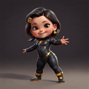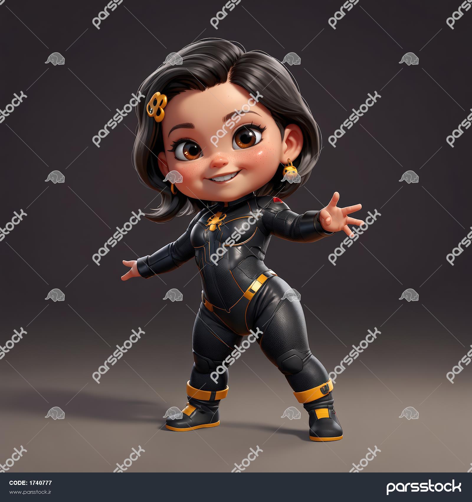 تصویر انیمیشنی دختر ابرقهرمان با لباس مشکی و زرد، ژست قدرت و نماد عنکبوت