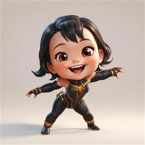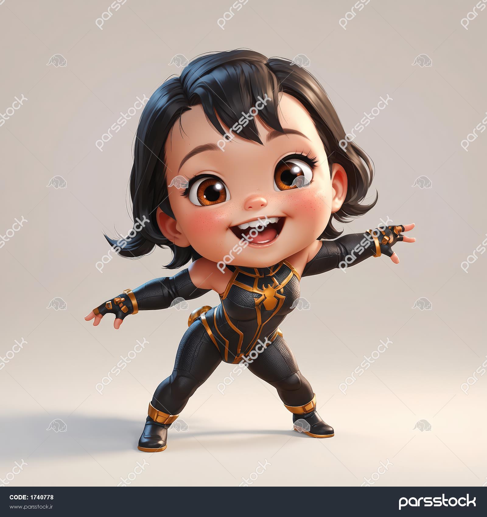 کاراکتر دختر کارتونی در لباس ابرقهرمانی مشکی و طلایی با نماد عنکبوت