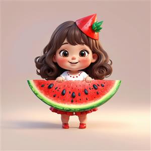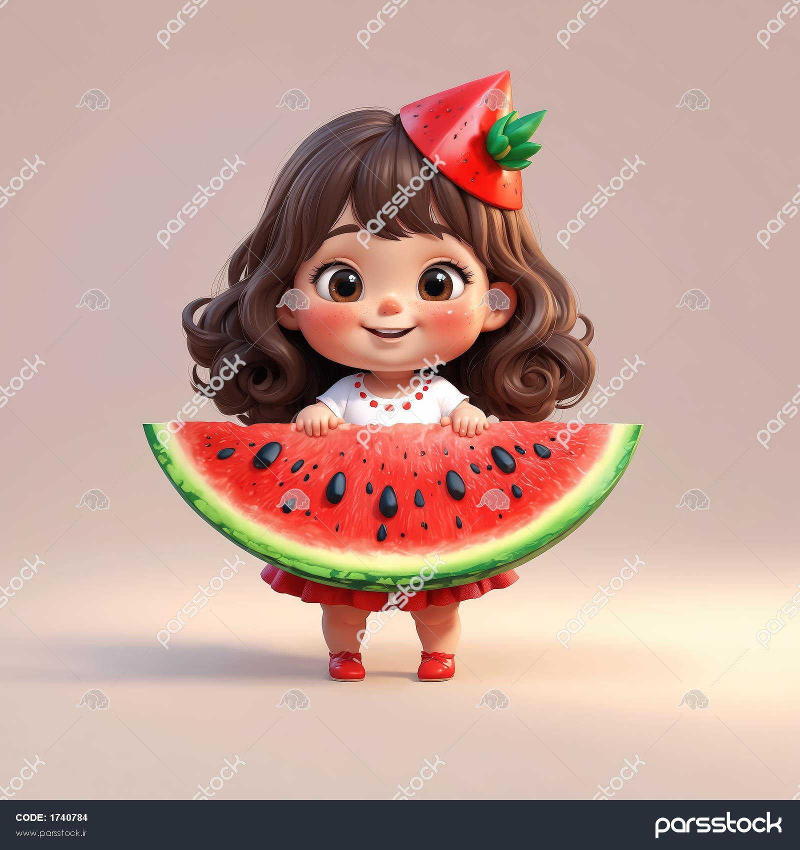 کاراکتر دختر بامزه با کلاه هندوانه‌ای و قاچ بزرگ هندوانه یلدا