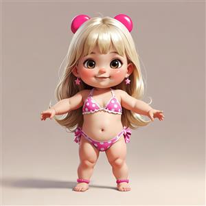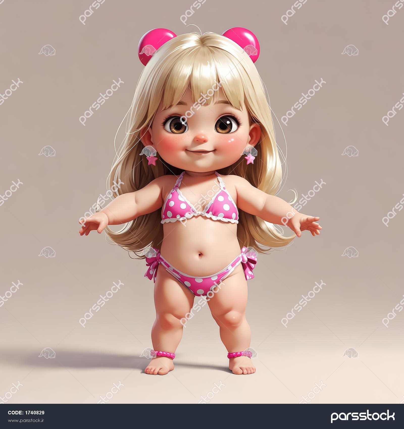 پرتره دختر کارتونی با بیکینی خالدار صورتی و گوشواره‌های فانتزی