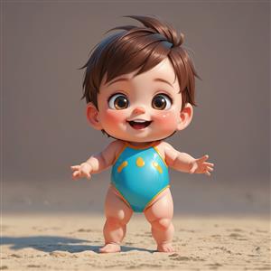 کودک کارتونی شاد با لباس شنای آبی در ساحل پس‌زمینه ساده